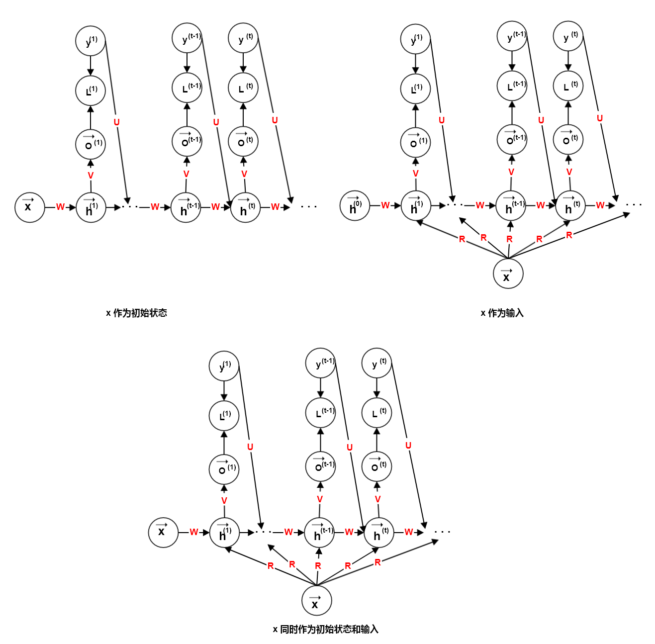 输入序列长度为1 :模型包含单个 作为输入。此时有三种输入方式:输入 作为每个时间步的输入、输入 作为初始状态 、以及这两种方式的结合。