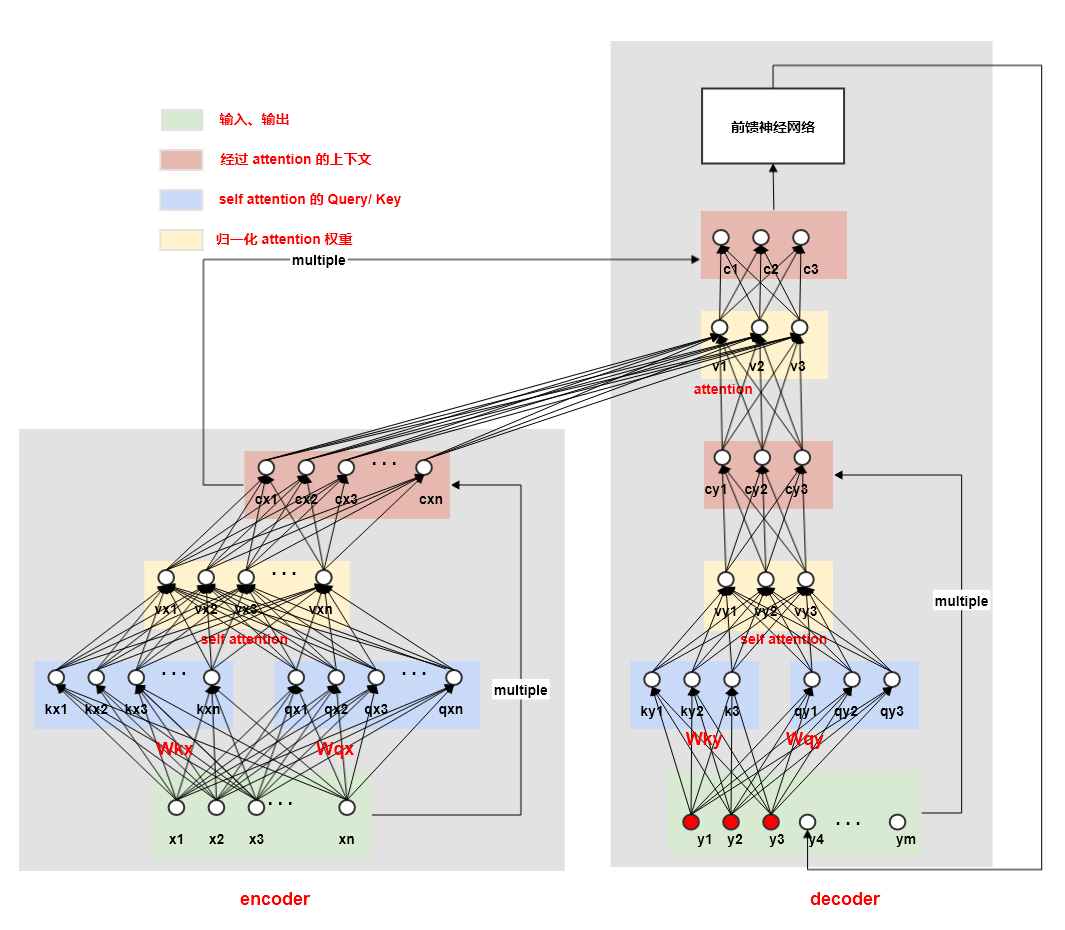 encoder 端计算自身的 attention,捕捉input 之间的依赖关系。decoder 端计算自身的 attention,捕捉output 之间的依赖关系。encoder 端得到的 self attention 加入到 decoder 端得到的 attention 中,捕捉输入序列的每个 input 和输出序列的每个 output 之间的依赖关系。