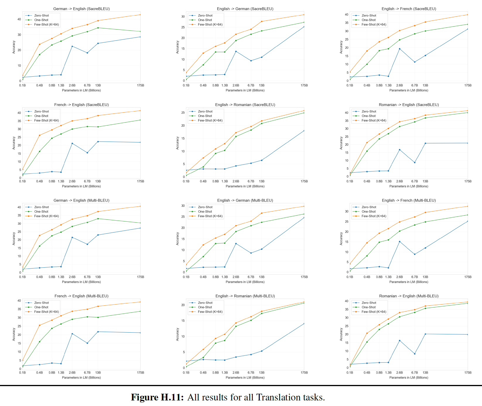 Zero-shot:所有 14 个任务的总体平均 zero-shot 性能如下图所示(忽略了 MultiRC 和 WIC )。总体而言,我们看到我们的平均性能遵循 GPT-3 的趋势。