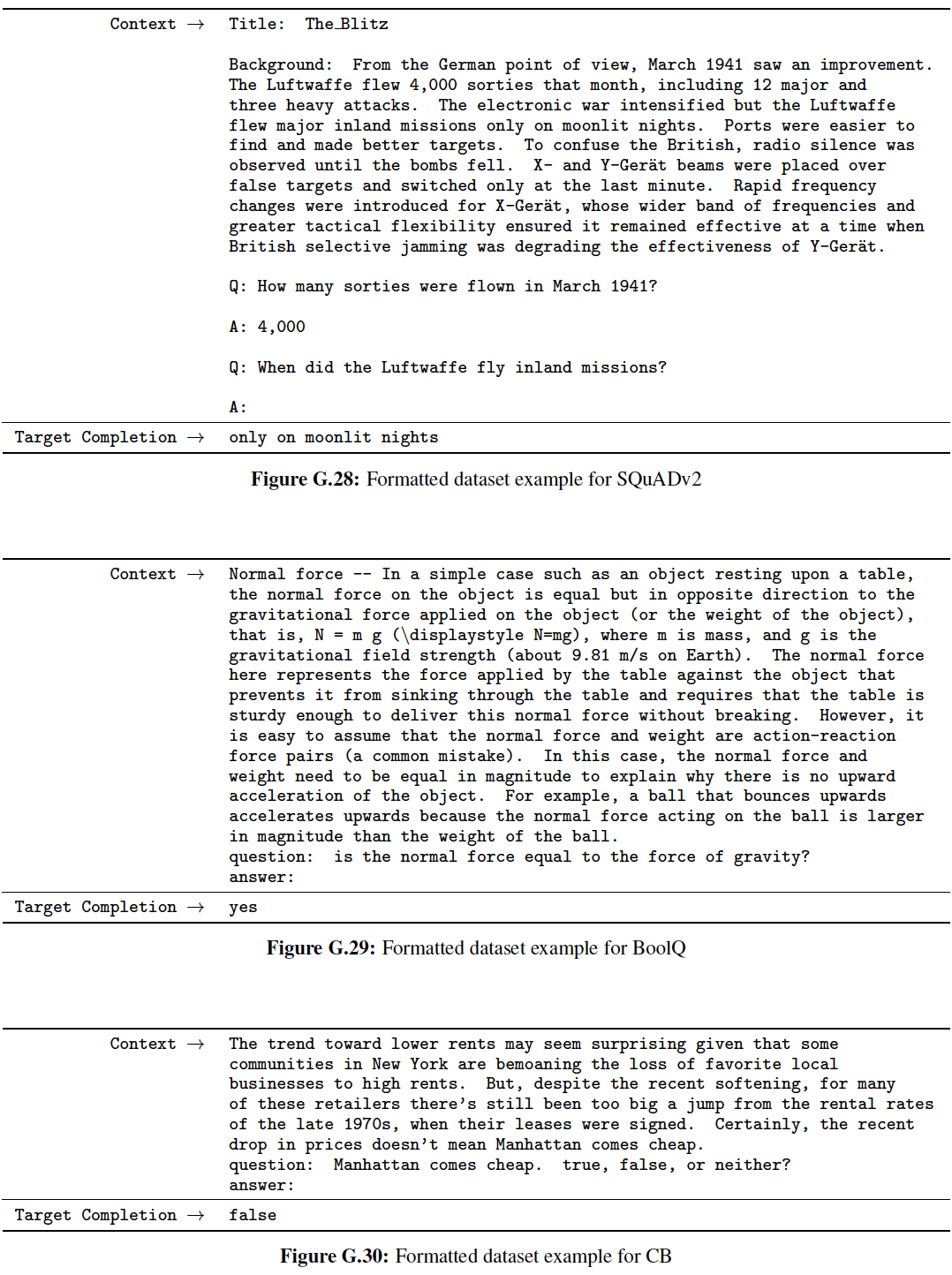HellaSwag:《Hellaswag: Can a machine really finish your sentence? 》。StoryCloze:《A corpus and evaluation framework for deeper understanding of commonsense stories》。PIQA:《Piqa: Reasoning about physical commonsense in natural language》。ARC Easy and Challenge:《Think you have solved question answering? try arc, the AI2 reasoning challenge》。OpenBookQA:《Can a suit of armor conduct electricity? A new dataset for open book question answering》。WinoGrad:《The Winograd schema challenge》。WinoGrande:《Winogrande: An adversarial winograd schema challenge at scale》。SuperGLUE:《SuperGLUE: A stickier benchmark for general-purpose language understanding systems》。我们遵从 GPT-3 并使用它的 prompt 和整体实验配置。我们主要与 GPT-3 进行比较,旨在重新实现它的评估配置 evaluation setting,但是在可能的情况下在每个任务上报告其它大语言模型的性能(Jurassic-1、Gopher、 Chinchilla、GPT-NeoX-20B)。