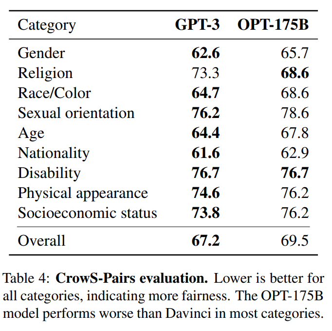 同样地,这可能是由于训练数据的差异所致。《Crows-pairs: A challenge dataset for measuring social biases in masked language models》 表明:Pushshift.io Reddit 语料库比其它语料库(如 Wikipedia)在 stereotype 和歧视性文本 discriminatory text 上具有更高的发生率。鉴于Pushshift.io Reddit 语料库是 OPT-175B 的一个主要数据源,因此OPT-175B 可能已经学习了更多的歧视性关联,从而直接影响了它在 CrowS-Pairs 上的性能。