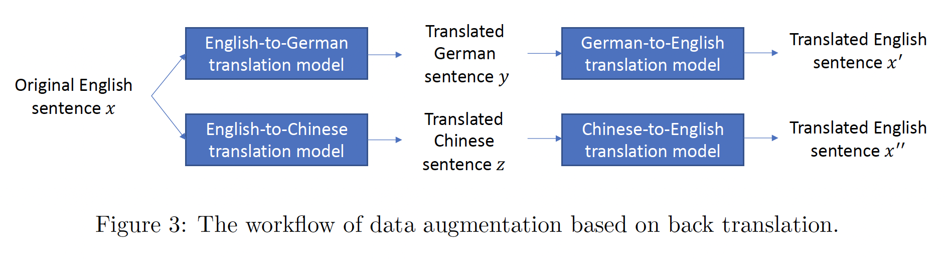 同样地,我们使用一个 English-to-Chinese 机器翻译模型和一个 Chinese-to-English 机器翻译模型来获得另一个 augmented sentence