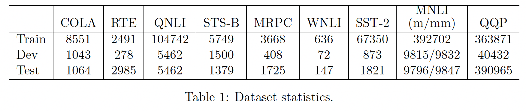 评估任务:General Language Understanding Evaluation: GLUE 基准,包含 11 个任务。我们通过向 GLUE 评估服务器提交推理结果来获得测试集的性能。数据集如下表所示。