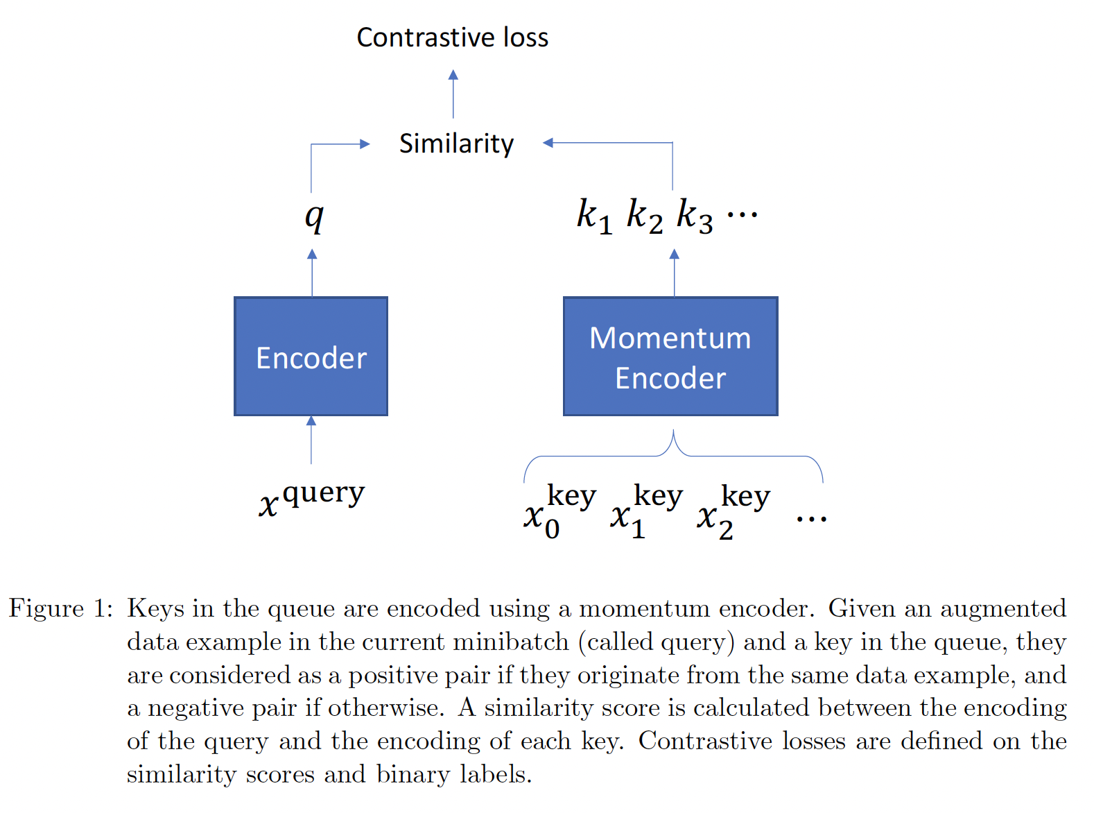 keys 是用 momentum encoder 编码的。给出当前 mini-batch 中的一个 augmented 样本(称为 query )、以及队列中的一个 key ,如果它们来自同一图像,则被认为是 positive pair ,否则就是 negative pair 。MoCo 计算 query encoding 和每个key encoding 之间的相似性得分。contrastive loss 是在相似度的得分和二元标签上定义的。