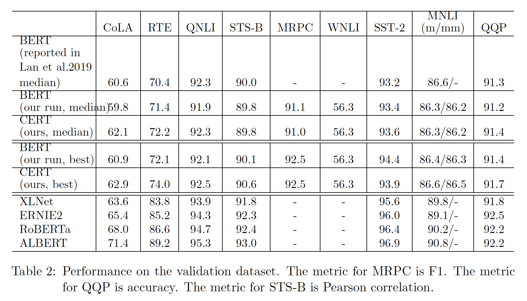 虽然 CERT 在 CoLA 的验证集上取得了比 BERT 好得多的性能,但在 CoLA 的测试集上比BERT 更差。这可能是因为 CoLA 的测试集和验证集有很大的 domain difference 。