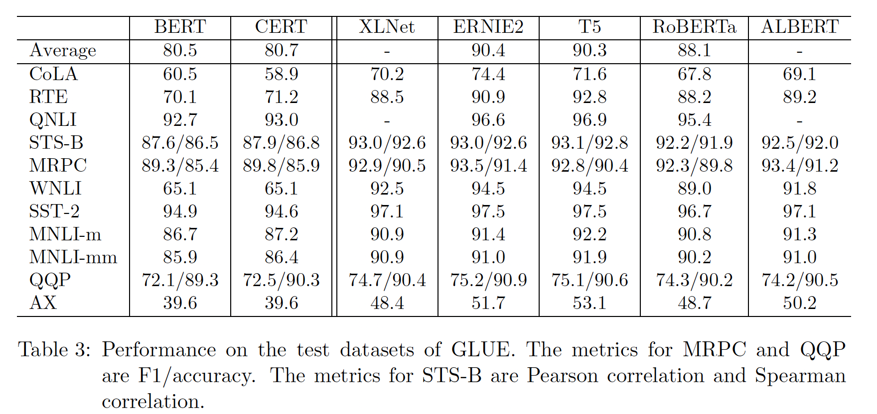 测试集上的评估结果:GLUE 任务中,测试集效果如下表所示。可以看到:
