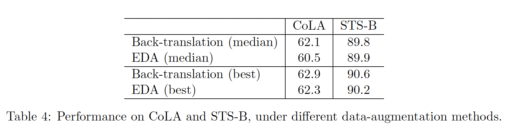 下表显示了 CERT 在 CoLA 和 RTE 任务上分别使用 back-translation 和 EDA 进行增强的结果。可以看到:总的来说, back-translation 取得了比 EDA 更好的结果,只是 back-translation 在 STS-B 上的中位数性能比 EDA 低0.1% 。