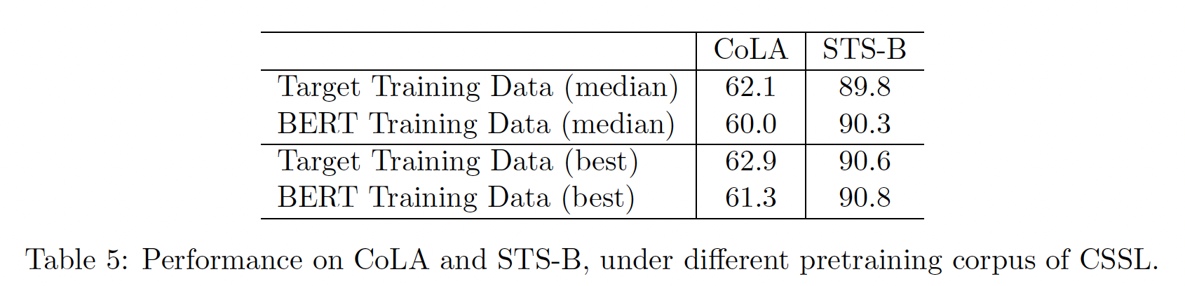 下表显示了在 CoLA 和 STS-B 上的表现,CSSL 在不同的语料库上进行了预训练。