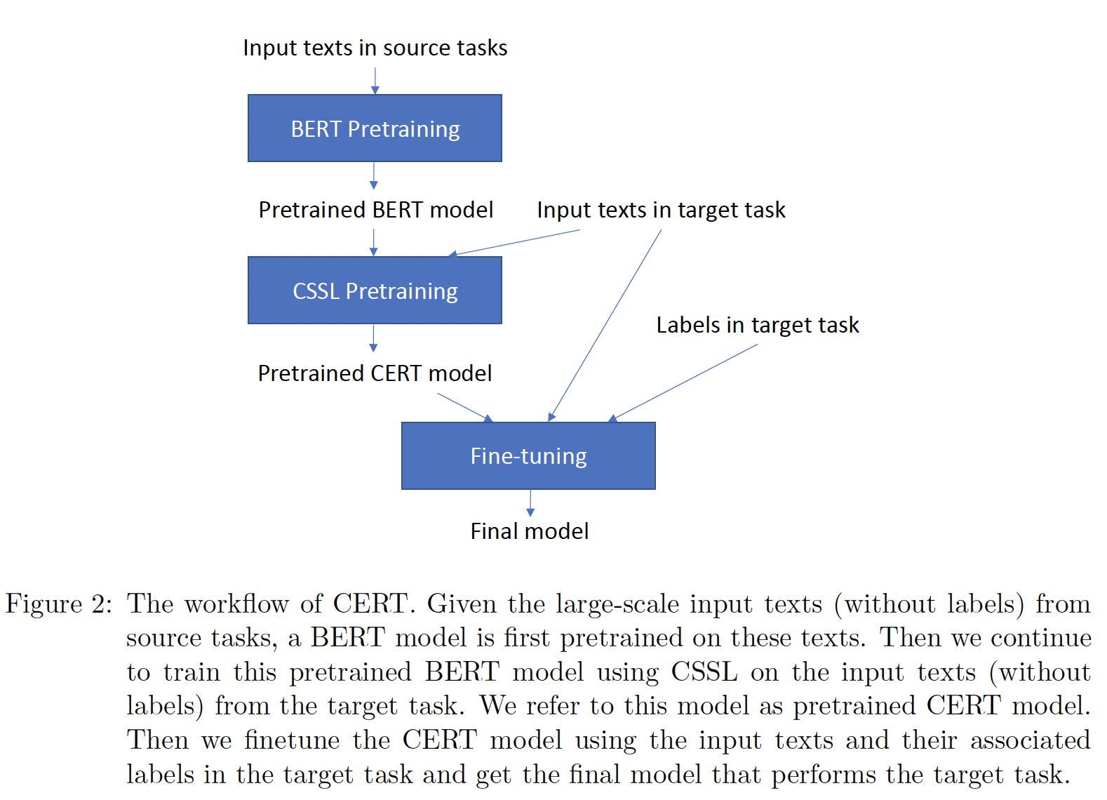 然后,我们使用目标任务中的输入文本及其标签对 CERT 模型进行微调,得到执行目标任务的最终模型。