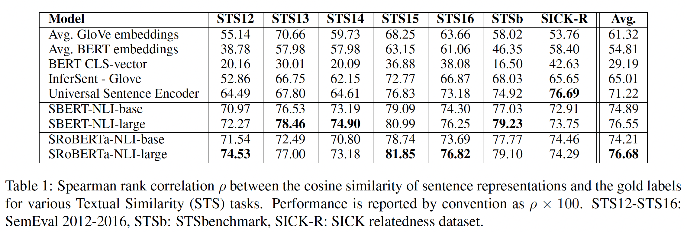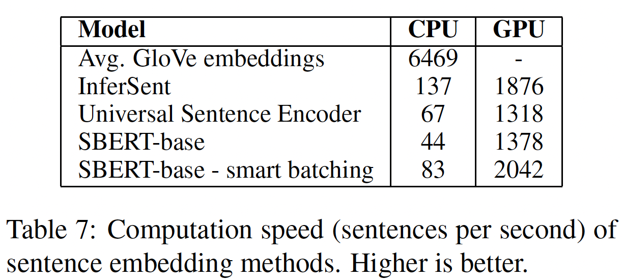 在七个 Semantic Textual Similarity: STS 任务上,SBERT 相对 InferSent 和 Universal Sentence Encoder 分别实现了 11.7 分和 5.5 分的改进。