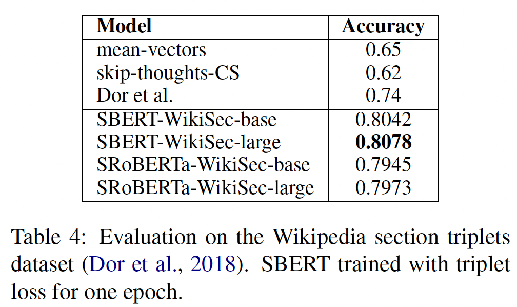 SBERT 可以适配特定的任务。它在一个具有挑战性的 argument similarity 数据集、以及一个区分维基百科文章不同部分的句子的 triplet dataset 上创造了新的 SOTA 性能。