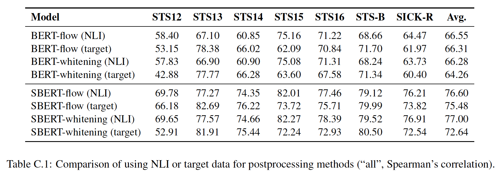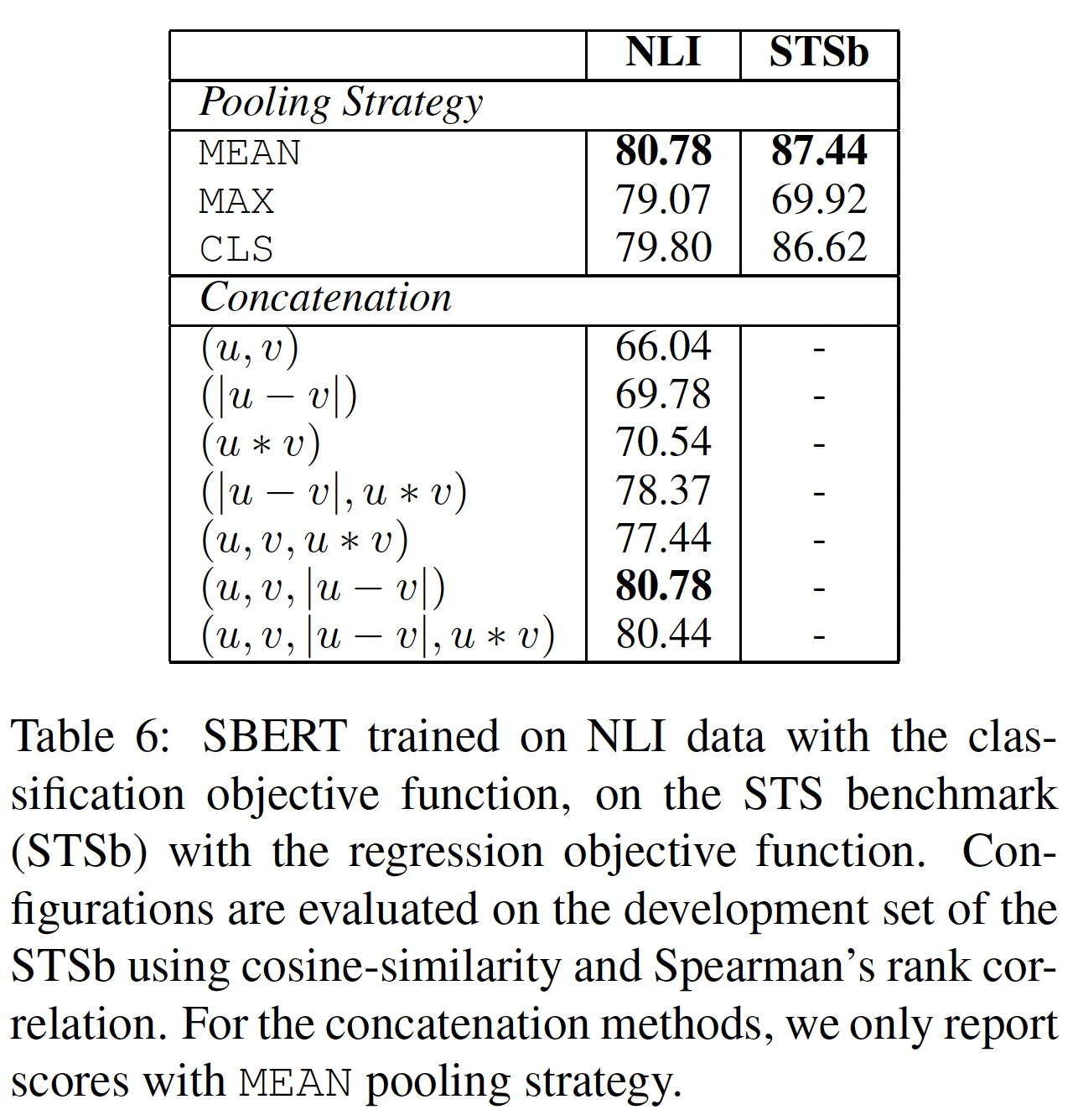 我们用 3-way softmax classifier objective function 对 SBERT 进行了微调,微调一个 epoch 。我们使用 batch size = 16,Adam 优化器(学习率为 2e-5 ),并使用线性学习率调度,其中在 10% 的训练数据上进行学习率预热。我们默认的池化策略是均值池化。