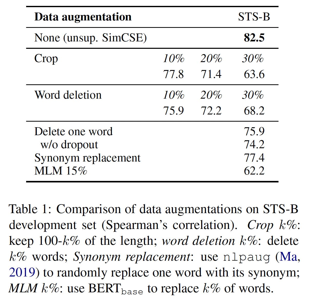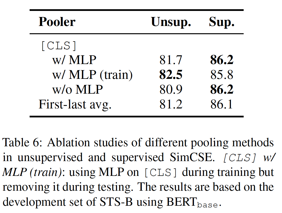 另一个原因可能是:通过 back-translation 增强的句子与原始句子有更大的差异。相比之下,由 EDA 增强的句子与原始句子很接近,因为 EDA 对原始句子进行了局部编辑,并保持了句子的大部分内容不受影响。因此,预测两个通过 back-translation 增强的句子是否来自同一个原句,要比预测那些通过 EDA 增强的句子更难。解决一个更具挑战性的 CSSL 任务通常会带来更好的 representation 。