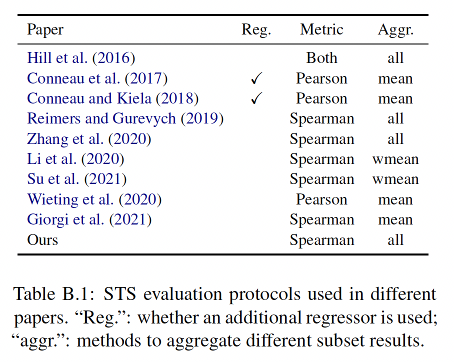 STS Benchmark:句子对之间的 semantic textual similarity: STS ,通过与人类判定的皮尔逊相关性进行评分。