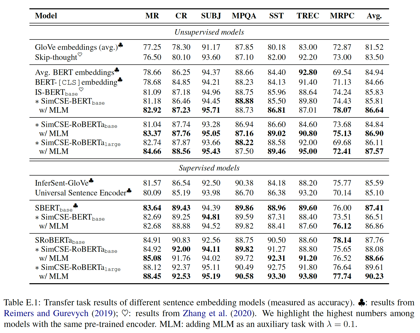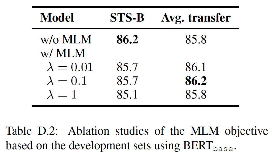 我们通过对 Stanford Natural Language Inference: SNLI 语料库中的监督数据进行训练来增强无监督学习。与InferSent的发现类似,我们观察到对 SNLI 的训练提高了迁移性能。