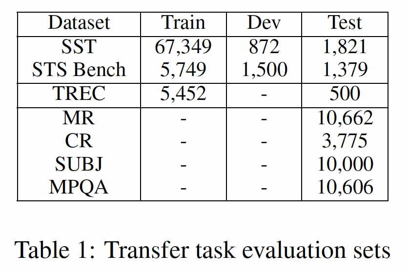 Transformer:在Transformer 中,我们通过对句子中每个 word representation 进行相加,从而得到 sentence representation 。具体而言,编码器将小写的 PTB tokenized string 作为输入,并输出一个 512 维的向量来作为 sentence embedding 。