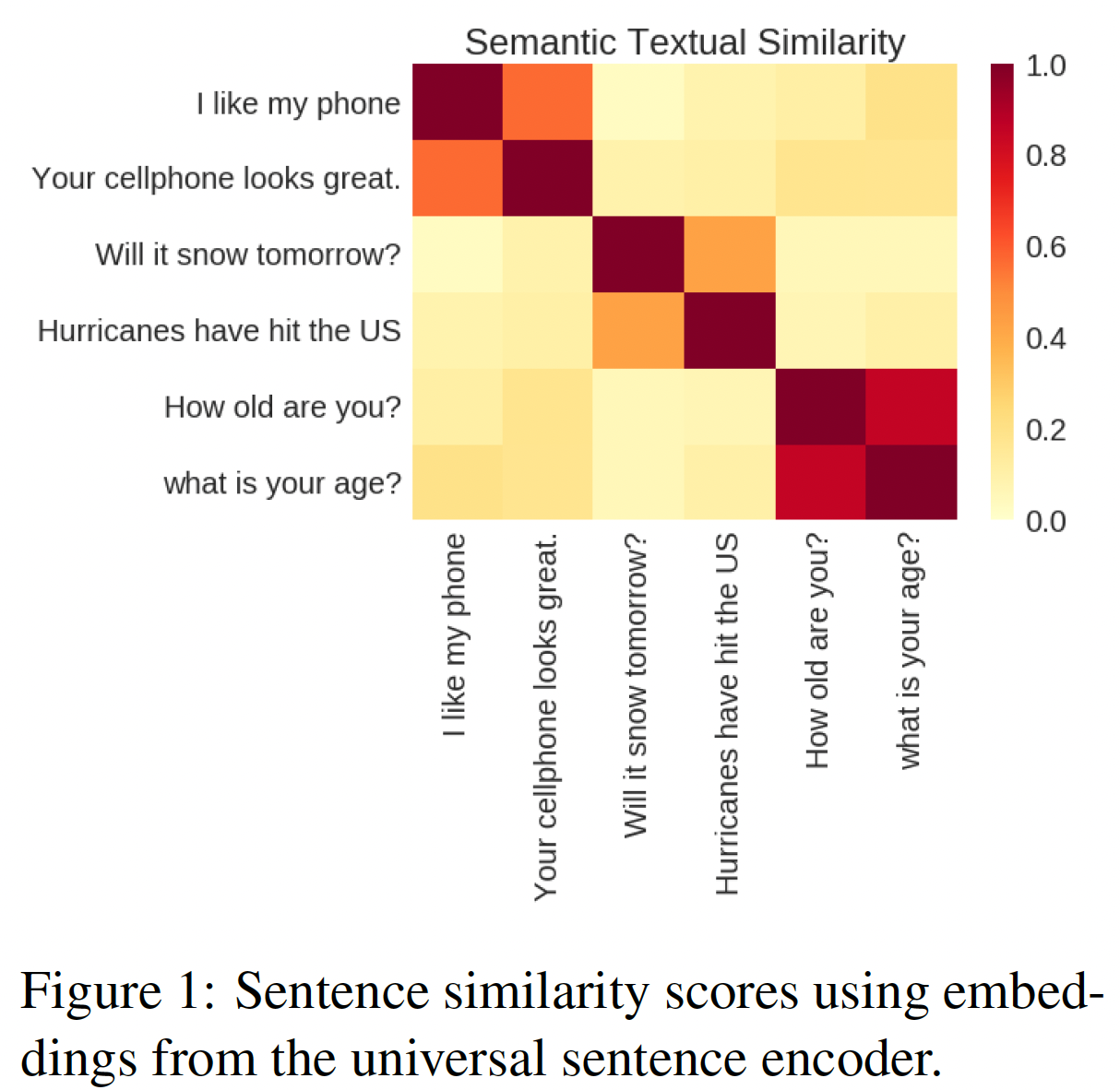 对于 pairwise semantic similarity 迁移任务,我们通过以下公式直接评估由Transformer sentence encoder 或 DAN sentence encoder 产生的 sentence embedding 的相似性: