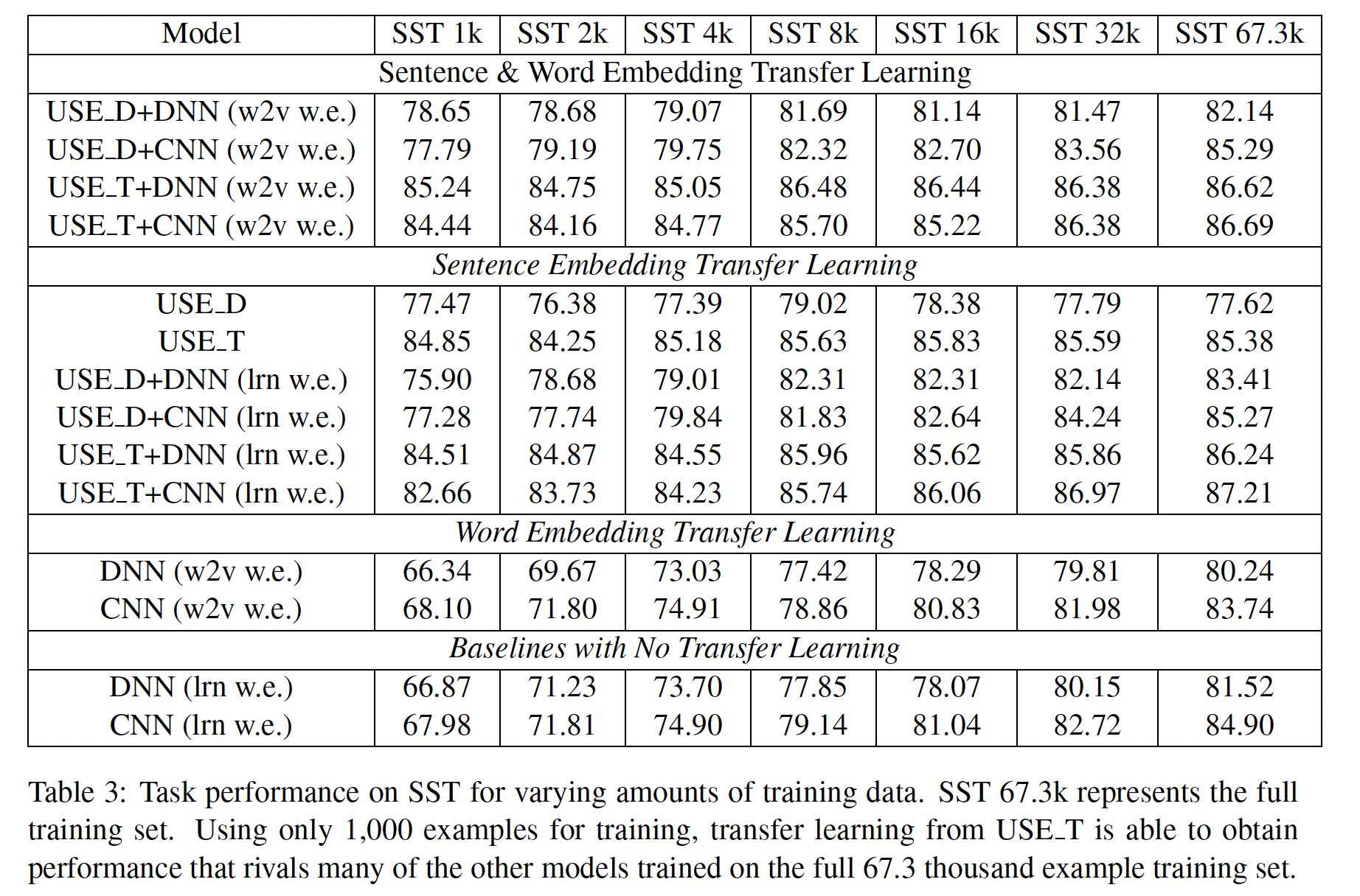 对于较少的数据量,sentence level 的迁移学习可以获得令人惊讶的任务表现。