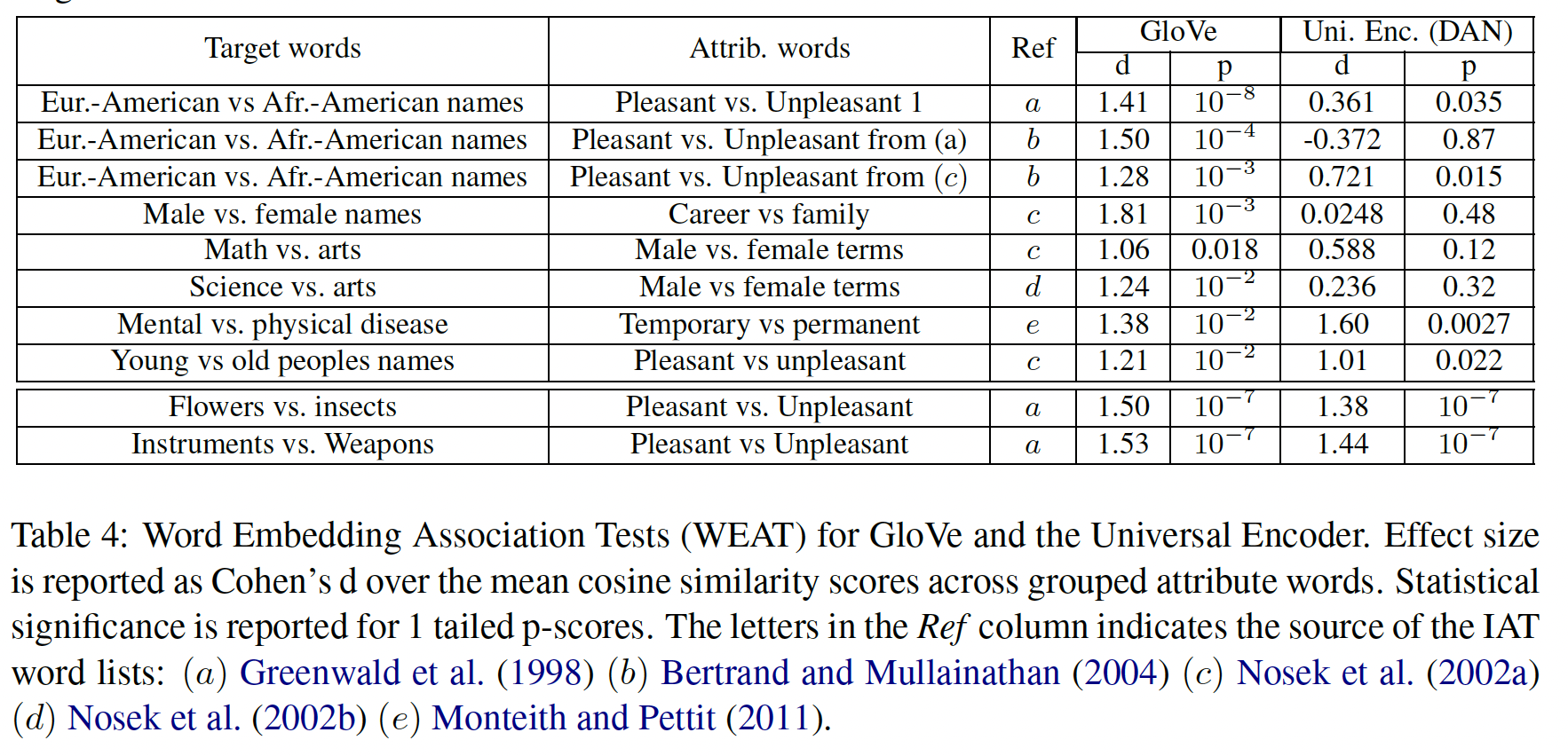 为了评估我们的 encoder模型的 bias ,我们评估了我们的模型在 WEAT 单词列表上学到的各种关联的强度。我们将我们的结果与《Semantics derived automatically from language corpora contain human-like biases》的结果进行了比较,他们发现 word embedding 可以用来重现人类在隐式关联任务上的表现,包括良性的关联和潜在的不良关联。