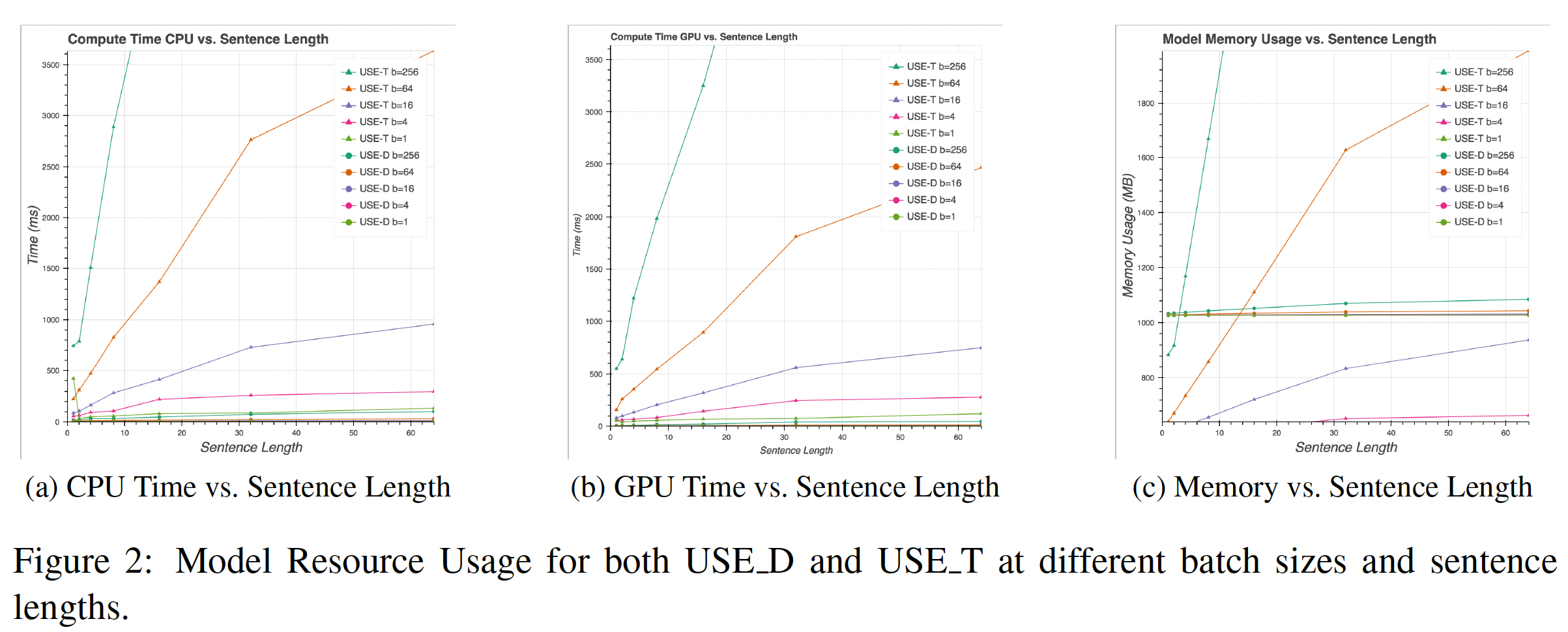 此外,作者还讨论了关于内存需求、以及 CPU/GPU 上的计算时间的 trade-off 。作者还对不同长度的句子进行了资源消耗比较。
