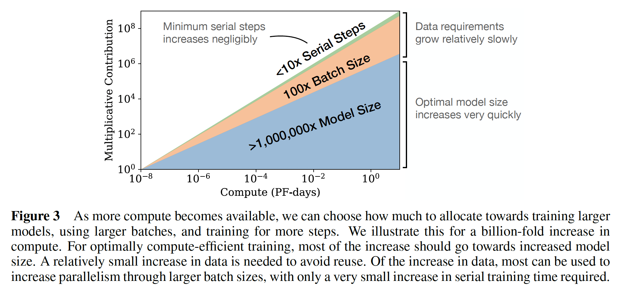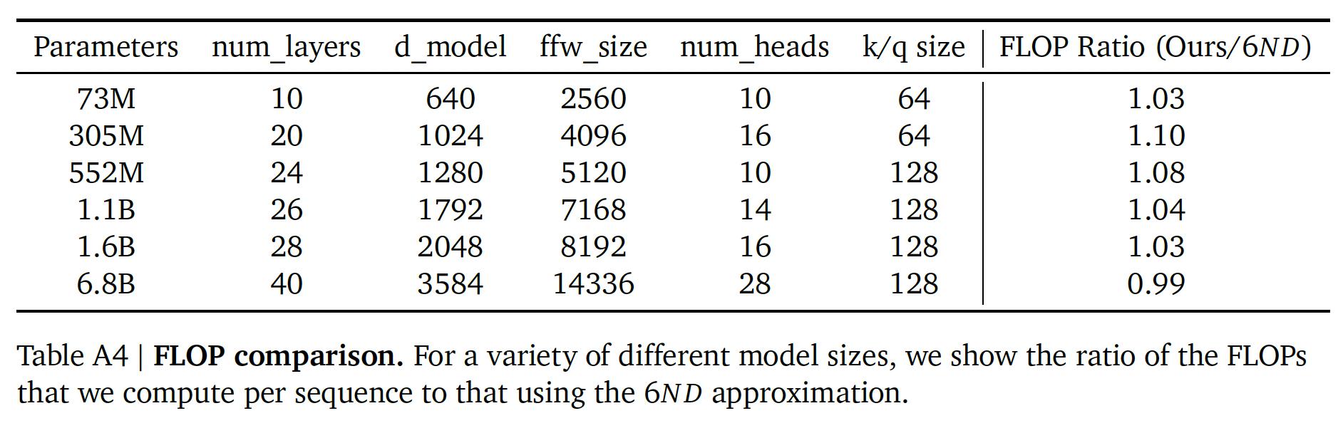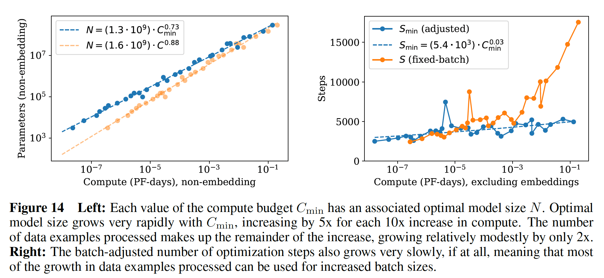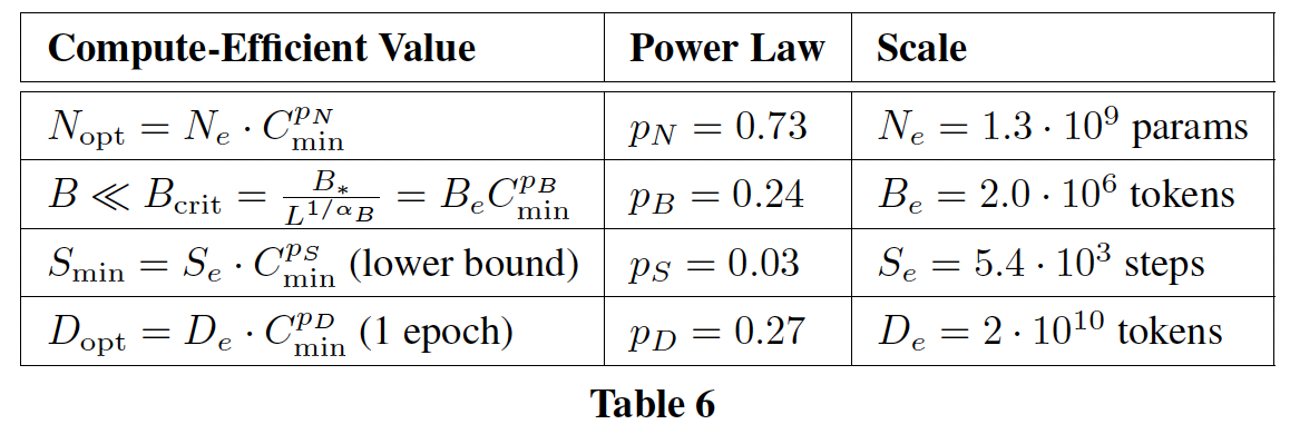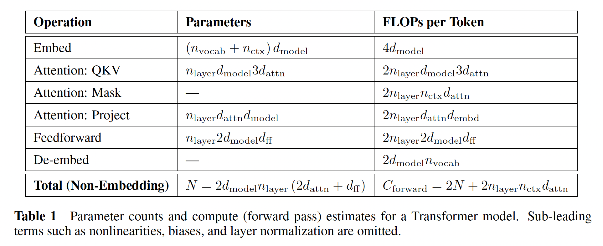 训练过程中使用的 non-embedding 计算总量可以估计为 batch size ,parameter updates 的数量,系数 6 代表了同时包含前向传播和反向传播。因此,对于一个给定的 step 数量