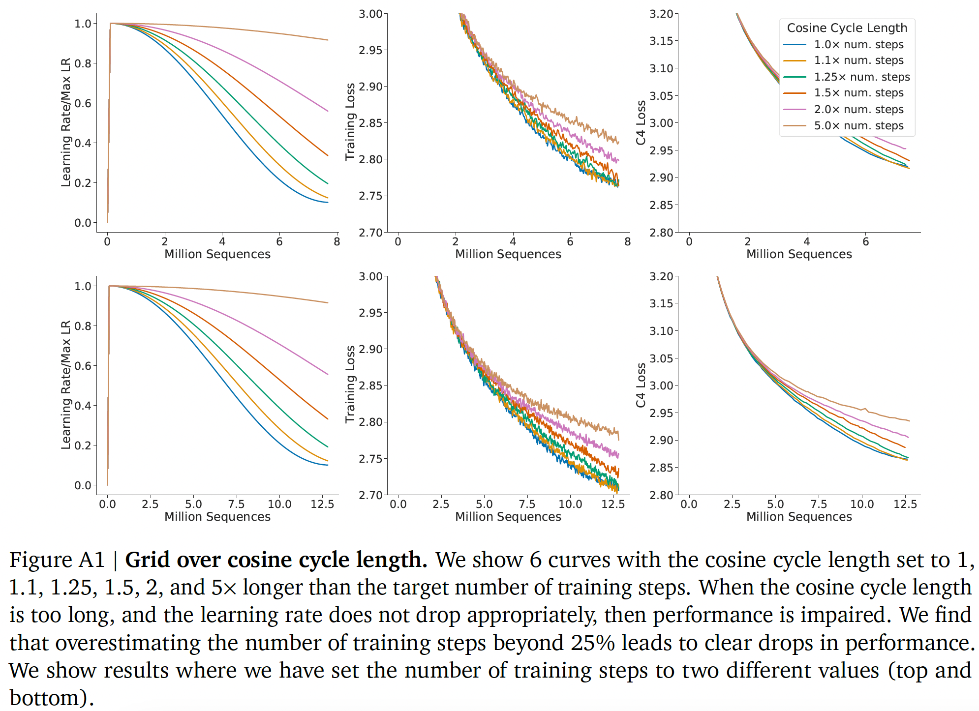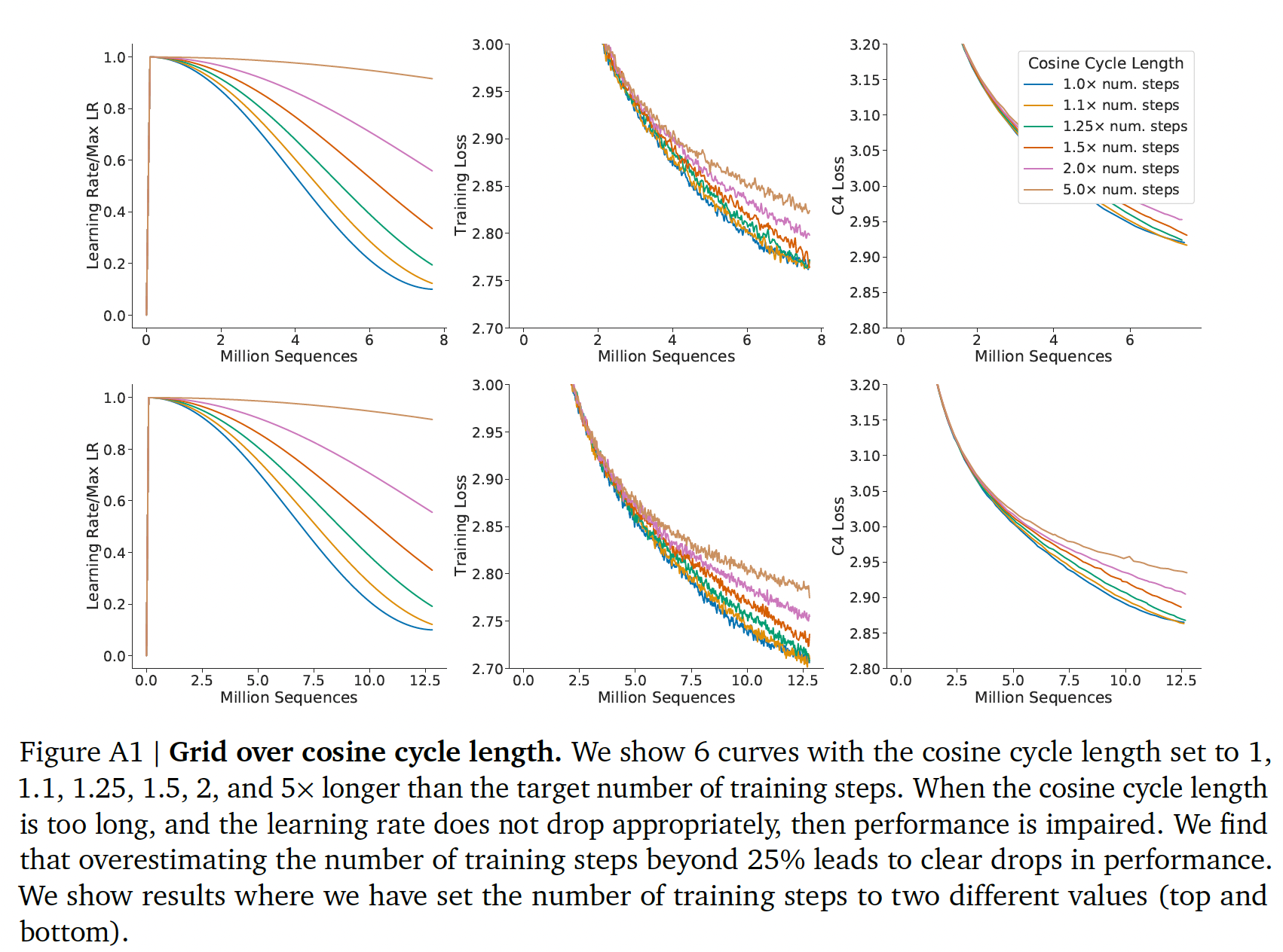 我们试验了各种学习率和 schedules 。我们发现,收敛的结果在很大程度上与 learning rate schedule 无关。除非另有说明,我们的数据中包括的所有 training runs 都使用了同一个 learning rate schedule ,即:3000 步的线性预热,然后是余弦衰减学习率到零。