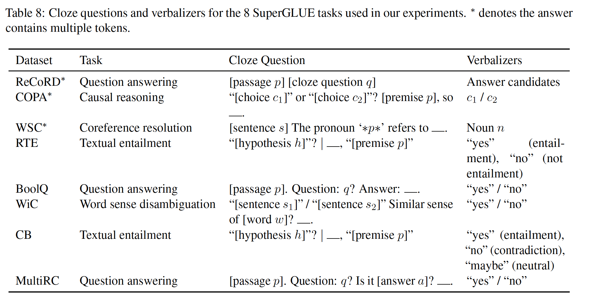 相反,我们遵从 PET (《Exploiting Cloze Questions for Few Shot Text Classification and Natural Language Inference》),将 NLU 分类任务重新表述为 blank infilling 的生成任务。具体来说,给定一个标记样本 mask token ,并且是用自然语言编写的从而代表任务的语义。例如,一个情感分类任务可以被表述为 "SENTENCE}. It’s really [MASK]"。候选标签 verbalizer "positive" 和"negative" 被映射到单词 "good" 和"bad" 上。给定