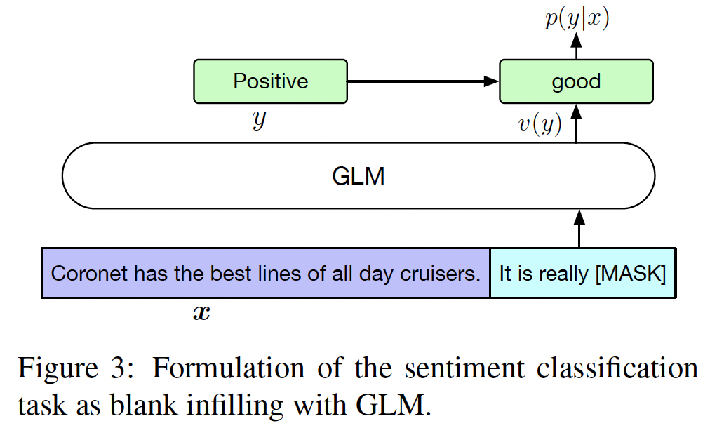 因此,句子是 positive 或 negative 的概率与 blank 处预测 "good" 或 "bad" 的概率成正比。然后我们用交叉熵损失对 GLM 进行微调(如下图所示)。
