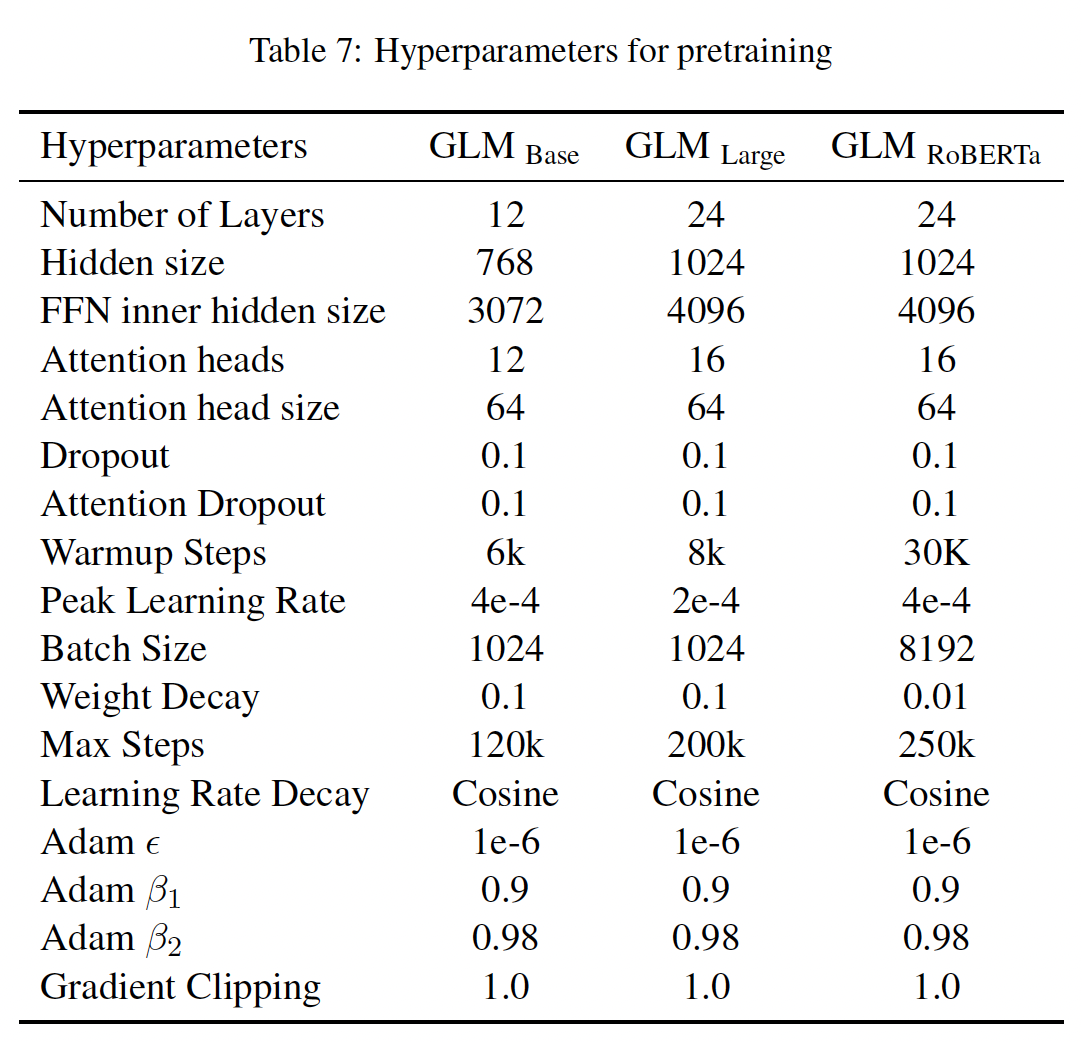 除了 GLM_410M 和 GLM_515M 的 Transformer 架构外,其他的超参数与 GLM_Large 相同。