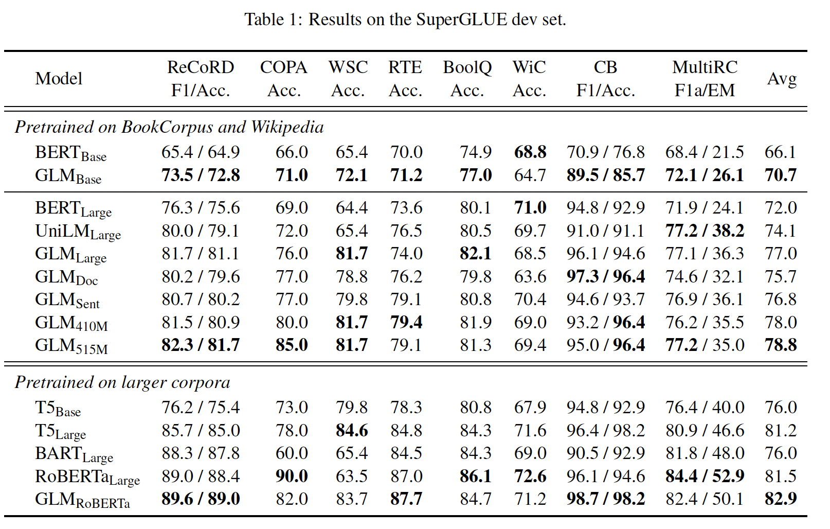 为了与 GLM_Base 和 GLM_Large 进行公平的比较,我们选择 BERT_Base 和 BERT_Large 作为我们的 baseline ,它们在相同的语料库上进行了预训练,并且训练时间相近。