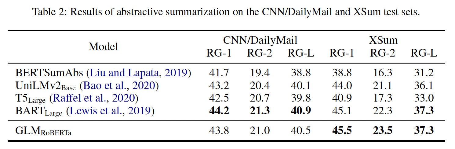 在较大的语料库上训练的模型的结果见 Table 2 。GLM_RoBERTa 可以达到与 seq2seq BART 模型相匹配的性能,并且超过了 T5 和 UniLMv2 。
