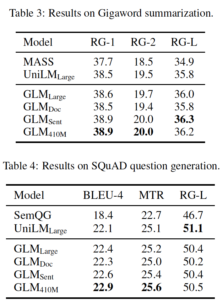 GLM_Large 可以在这两个生成任务上实现与其他预训练模型相匹配的性能。