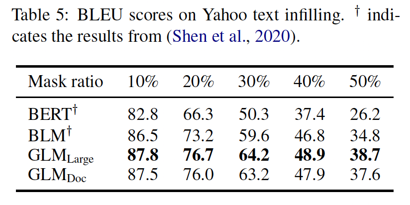 Text Infilling:text infilling 是预测与周围上下文一致的 missing spans of text 的任务。GLM 是用 autoregressive blank infilling objective 训练的,因此可以直接解决这个任务。我们在 Yahoo Answers 数据集上评估了GLM ,并与 Blank Language Model: BLM 进行了比较,后者是专门为 text infilling 设计的模型。从下表的结果来看,GLM 以较大的优势(1.3 ~ 3.9 BLEU )超过了以前的方法,在这个数据集上取得了 SOTA 的结果。我们注意到,GLM_Doc 的表现略逊于 GLM_Large ,这与我们在 seq2seq 实验中的观察结果一致。