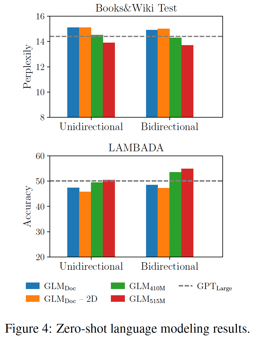 在预训练期间没有 generative objective ,GLM_Large 不能完成语言建模任务,困惑度大于100 (未在图中标识)。