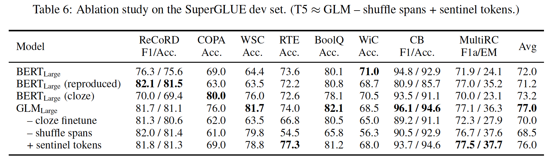 第 6 行显示,移除 shuffle span (总是从左到右预测masked span )会导致 SuperGLUE 的性能严重下降。