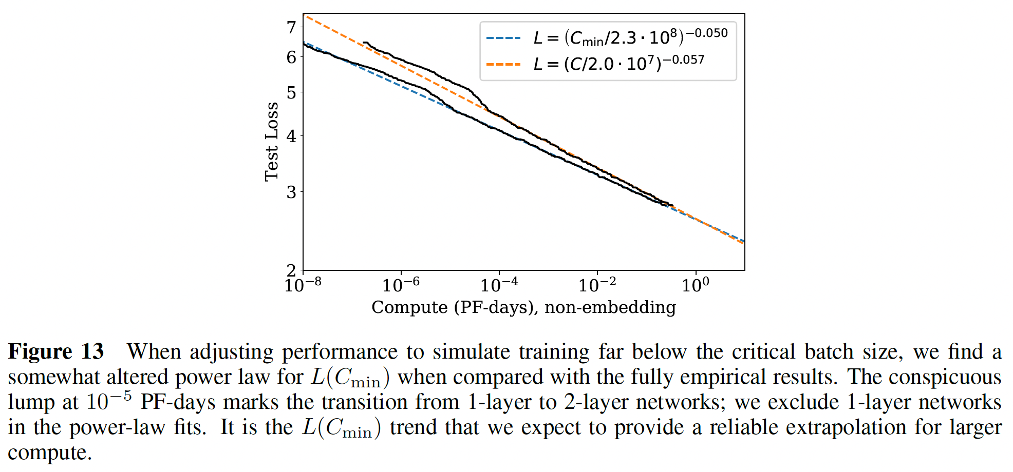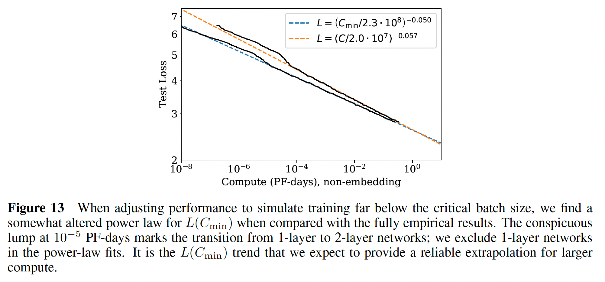 loss 的最小 non-embedding compute 的估计。这是在模型以远小于 critical batch size的 batch size 进行训练时将使用的 training compute 。