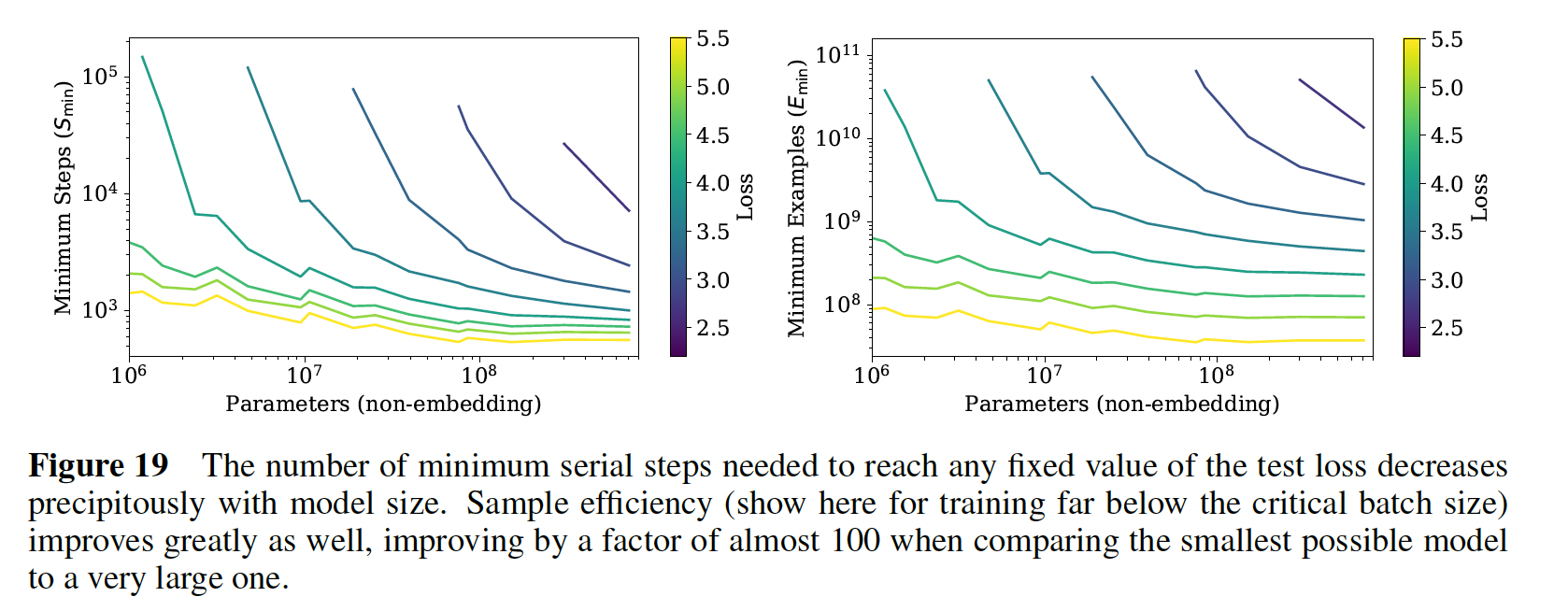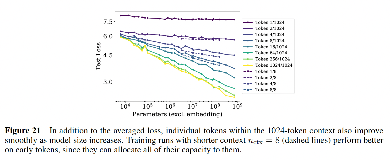 在固定模型大小的情况下, loss scale 似乎与上下文中的位置 power-law correlation 的结果,或者是模型结构和 optimization 的一个更普遍的特征。它为在更大的上下文中训练的潜在好处(或潜在不足)提供了一些建议。不仅较大的模型在 early tokens 时也改善得更快,这表明较大的模型在检测 less contextual information 的模式时更有效率。