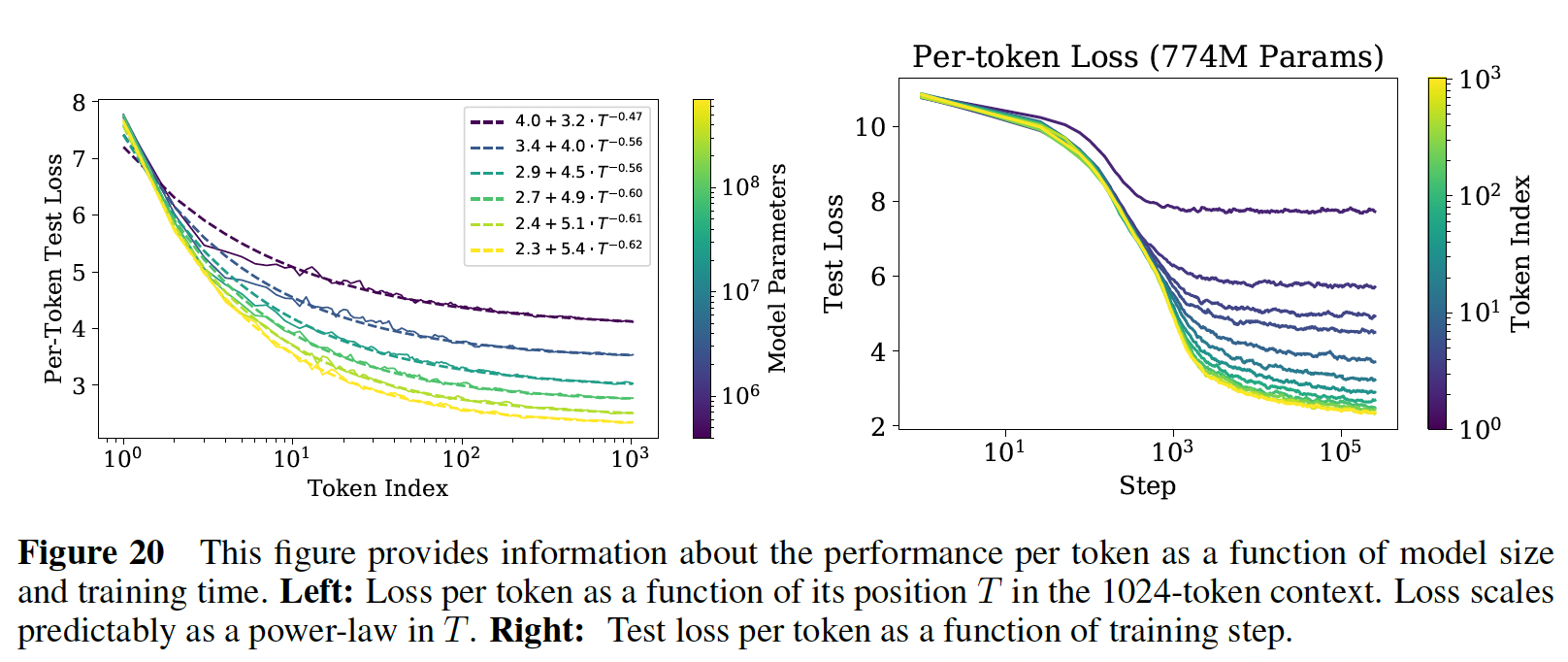 在右边的图中,我们显示了对于一个固定的模型, per-token 性能是如何作为 training steps 的函数而变化的。early tokens 在训练过程中更快地被学好,而末尾的 tokens 在训练的后期才能训练好。