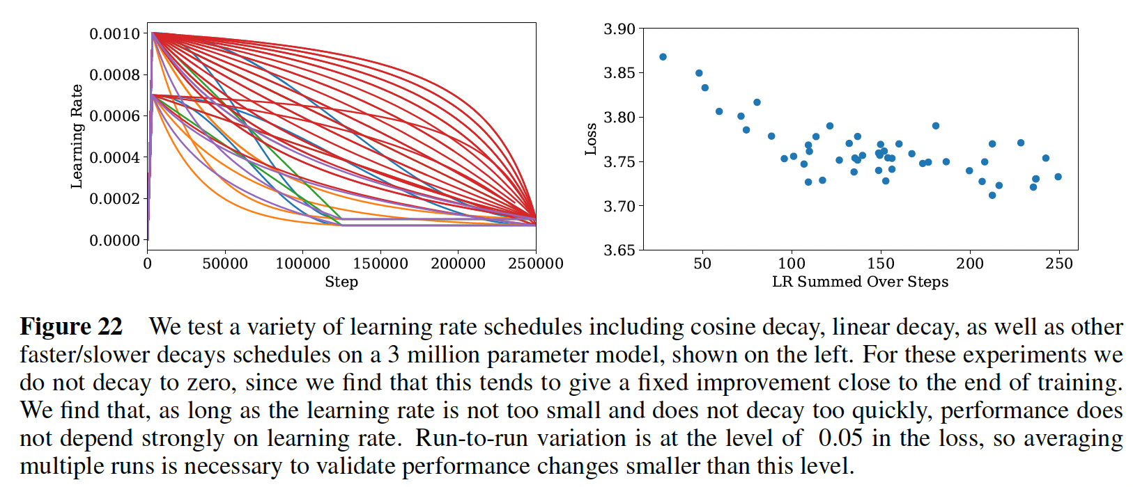 我们用各种学习率和 schedule 进行了实验。下图显示了一个小型语言模型的一系列 schedules 和测试结果。我们的结论是,只要 total summed learning rate 足够大,而且 schedule 包括一个预热期、以及最后衰减到接近零的学习率,那么 learning rate schedule 的选择基本上是不重要的。schedules 之间的方差似乎是统计学上的噪音,并为不同 training runs 之间的方差的 scale 提供一个粗略的衡量标准。在较大的模型上的实验表明,对于不同的模型大小,不同的随机种子之间的 final test loss 的方差的幅度是大致不变的。