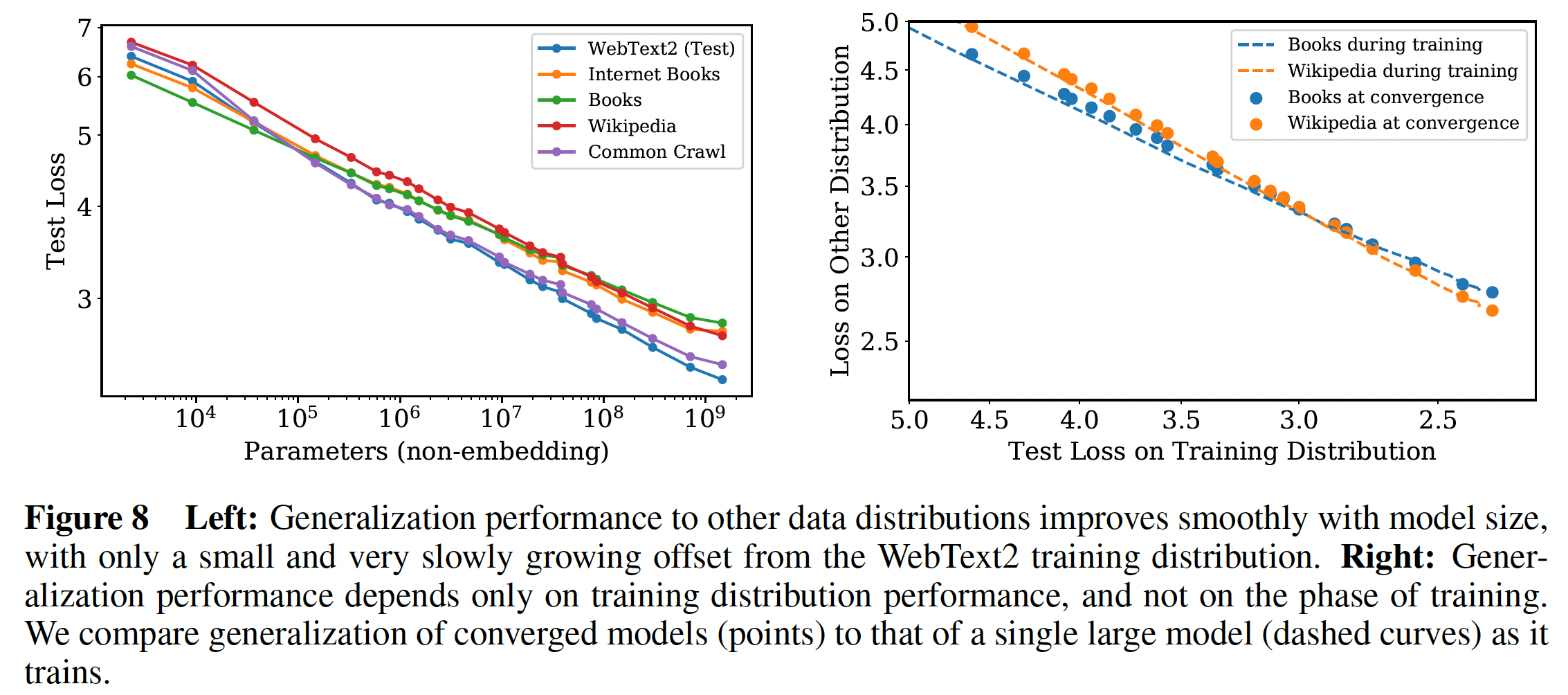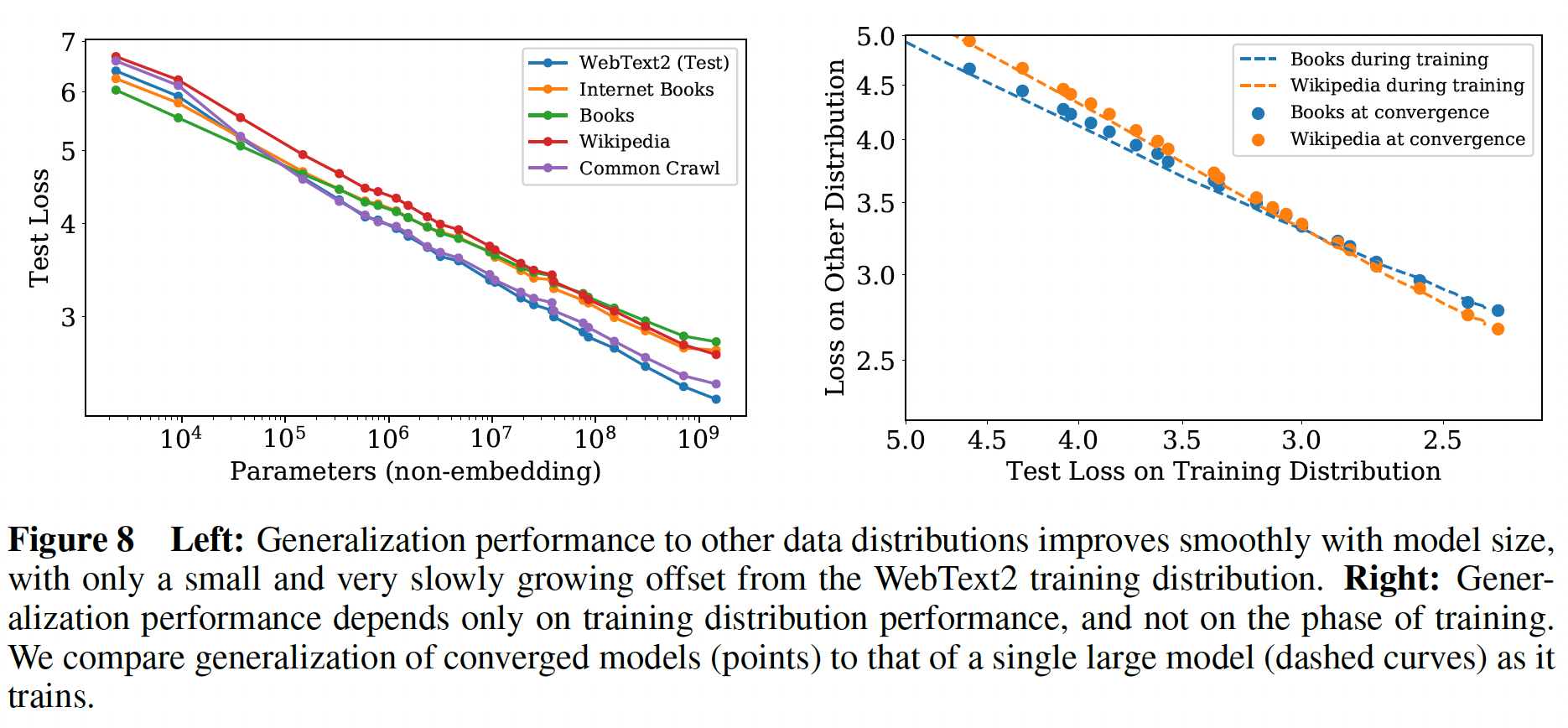 从左图中我们看到,在这些其他数据分布上的 loss 随着模型规模的增加而平滑地改善,直接地平行于 WebText2 的 test loss 曲线。