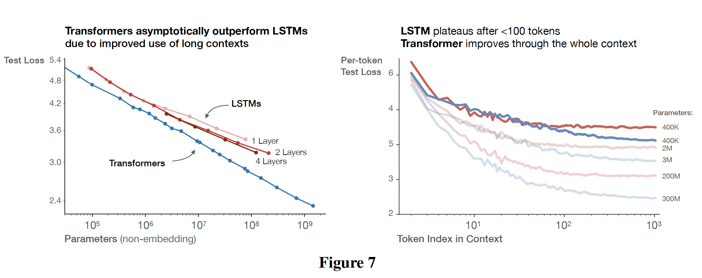 在下图中,我们比较了 LSTM 和 Transformer 的性能与 non-embedding 参数数量 LSTM 是用与 Transformer 相同的数据集和上下文长度来训练的。从右图中我们可以看出,LSTM 对于上下文位置中头部出现的 token 表现得和 Transformer 一样好,但是对于上下文位置中尾部出现的 token 则无法与 Transformer 的表现相媲美。