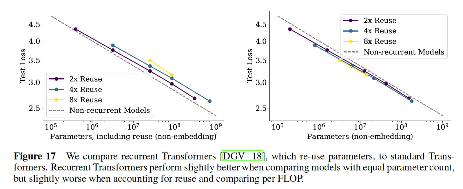 我们还在下图中比较了标准 Transformer 和 recurrent Transformer (《Universal transformers》)的性能。 recurrent Transformer 模型复用参数,因此表现得略好(右图),但代价是每个参数的额外计算量。