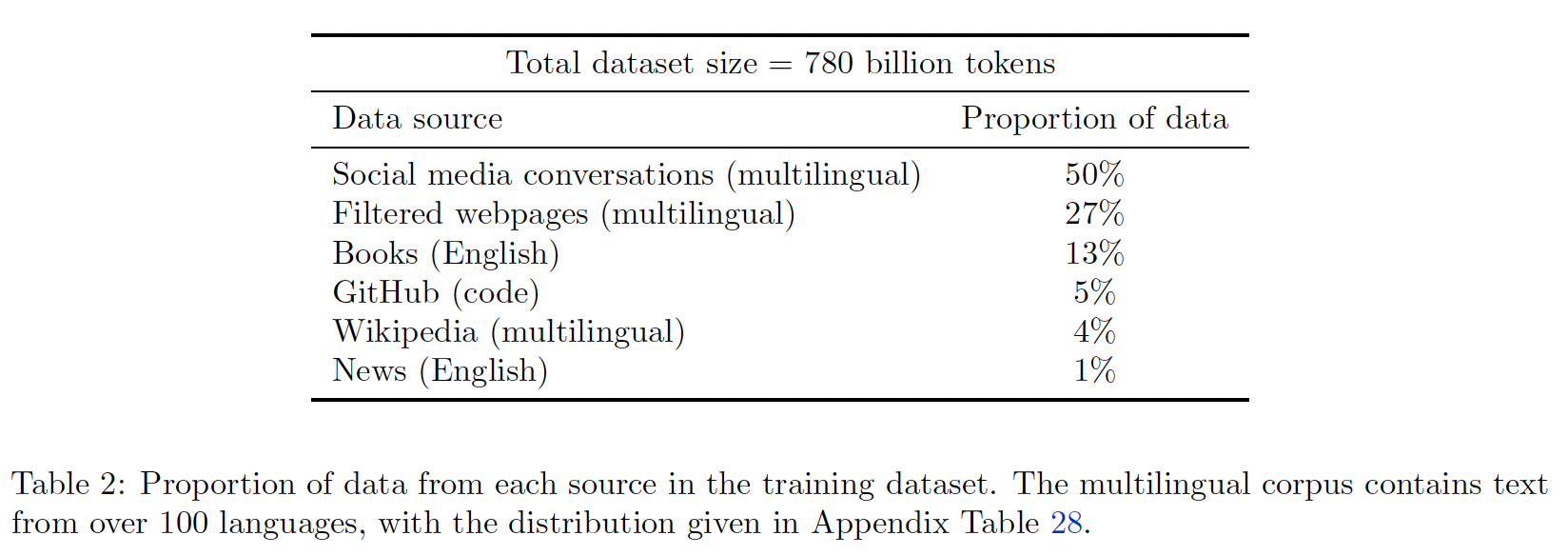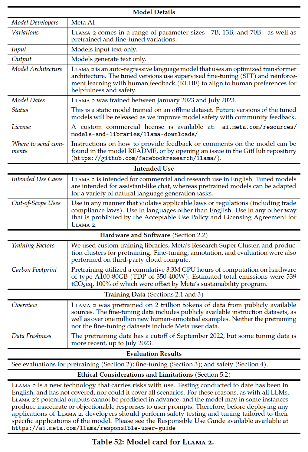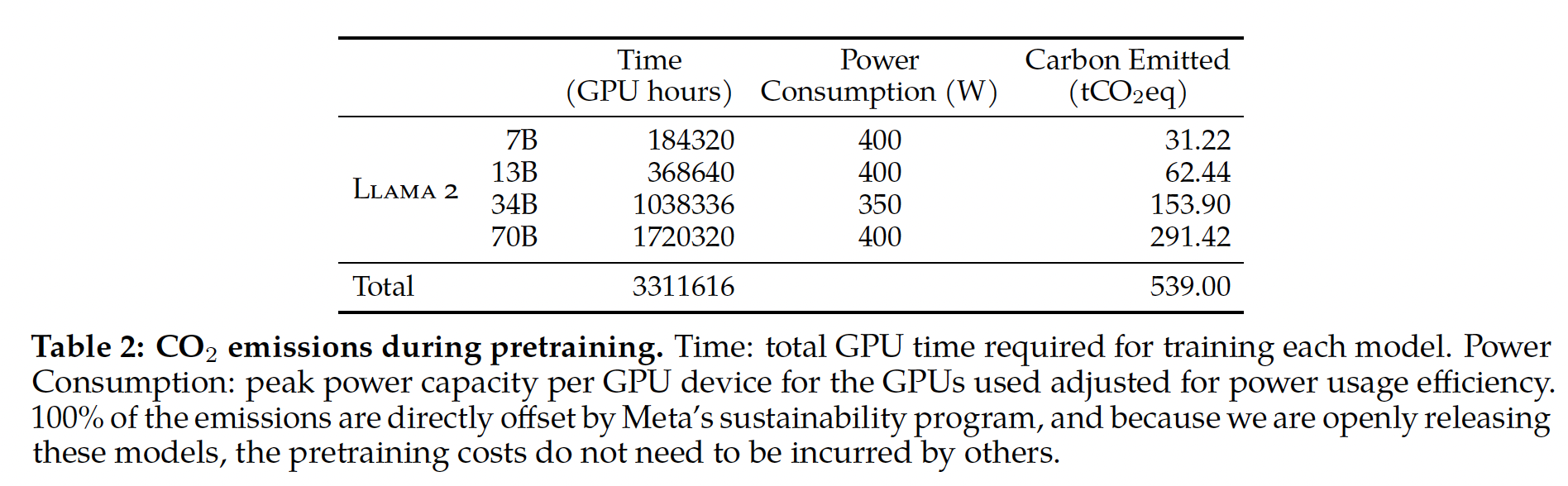 Steps Taken to Pretrain Responsibly:我们遵循 Meta 的标准隐私和法律审查流程,审查了每个用于训练的数据集。我们没有在训练中使用任何 Meta 用户数据。我们排除了一些已知包含大量关于私人的个人信息的网站的数据。我们尽最大努力提高模型训练的效率,以减少 pretraining 的碳足迹(请参考 Carbon Footprint of Pretraining 的内容)。广泛分享我们的模型将减少其他人训练类似模型的需要。为了让 Llama 2 能够更广泛地用于各种任务(例如,它可以更好地用于仇恨言论分类),我们没有对数据集进行额外过滤,同时避免了过度清洗有时会造成的偶然的人口统计上的消除(accidental demographic erasure )。重要的是,这使得 Llama 2-Chat 能够在 safety tuning 中用更少的样本进行更有效的泛化。因此,应谨慎使用 Llama 2 模型,并且只有在应用 significant safety tuning 之后才部署。