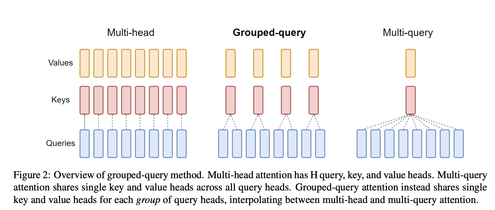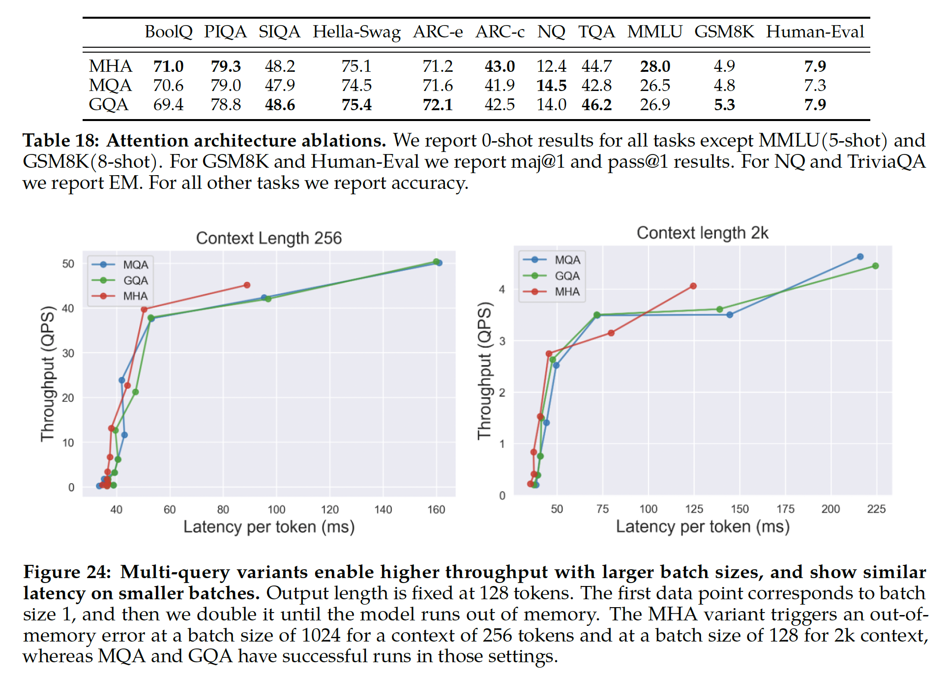 Multi-Query Attention:标准的 Transformer 公式使用 attention head,其中在每个 timestep 中,输入向量被线性投用到 query, key, value 张量,query/key/value 张量的形状都是 attention head size 。