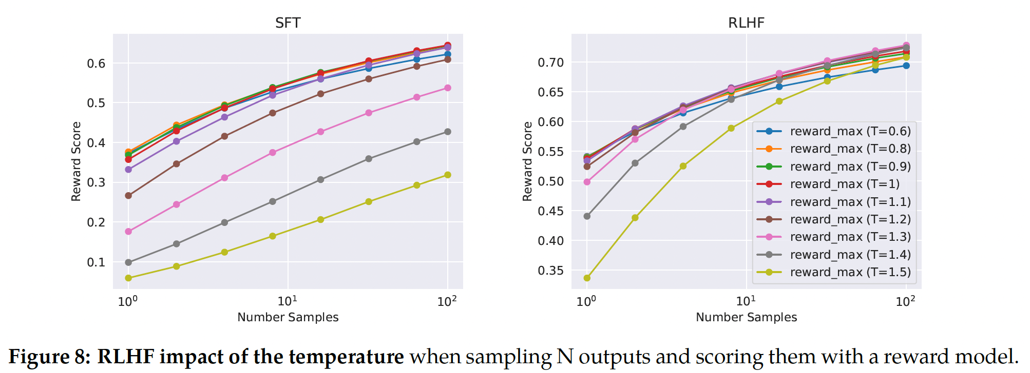 In-Context Temperature Rescaling:我们观察到一个与 RLHF 相关的有趣现象,这是我们所知目前未曾报道的:根据上下文动态地重新缩放温度。如 Figure 8 所示,温度似乎受 RLHF 的影响。然而,有趣的是,我们的发现也表明,温度变化并非均匀地应用于所有 prompts ,如 Figure 21 所示。