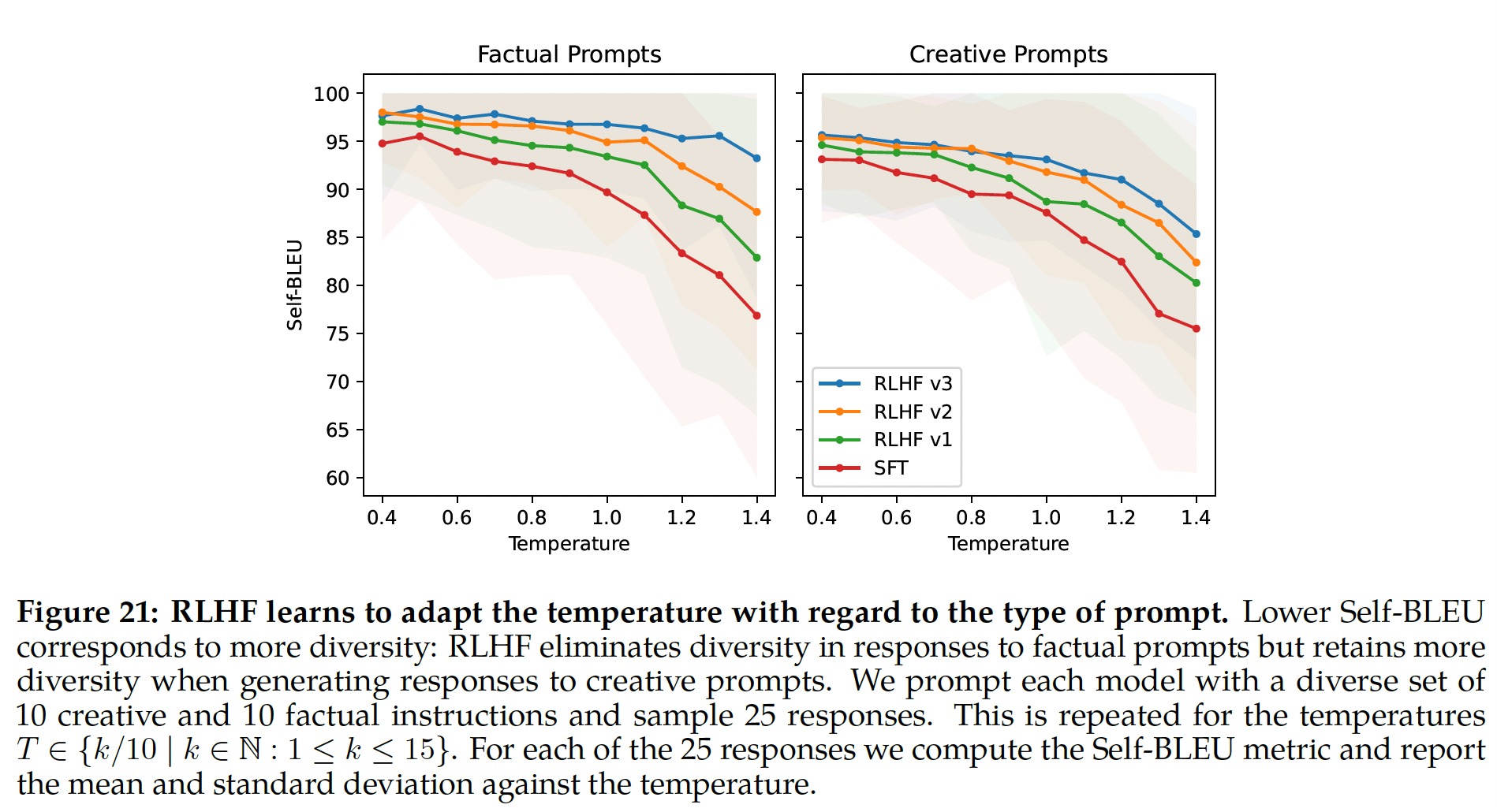 例如,当涉及 creativity 的 prompts 时,如 “写一首诗”,温度的增加在我们的各个 RLHF iterations 中继续产生多样性。这可以在 Self-BLEU 斜率中观察到,它反映了一种模式,这种模式与 SFT 模型相媲美。