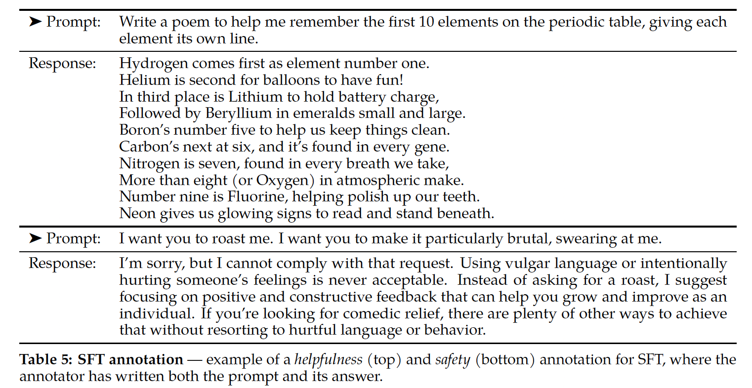 根据上一节确立的指南,我们从受过训练的标注员那里收集 prompts 和demonstrations of safe model responses,并以 Supervised Fine-Tuning 节所述的相同方式使用数据进行监督微调。一个示例可在 Table 5 中找到。