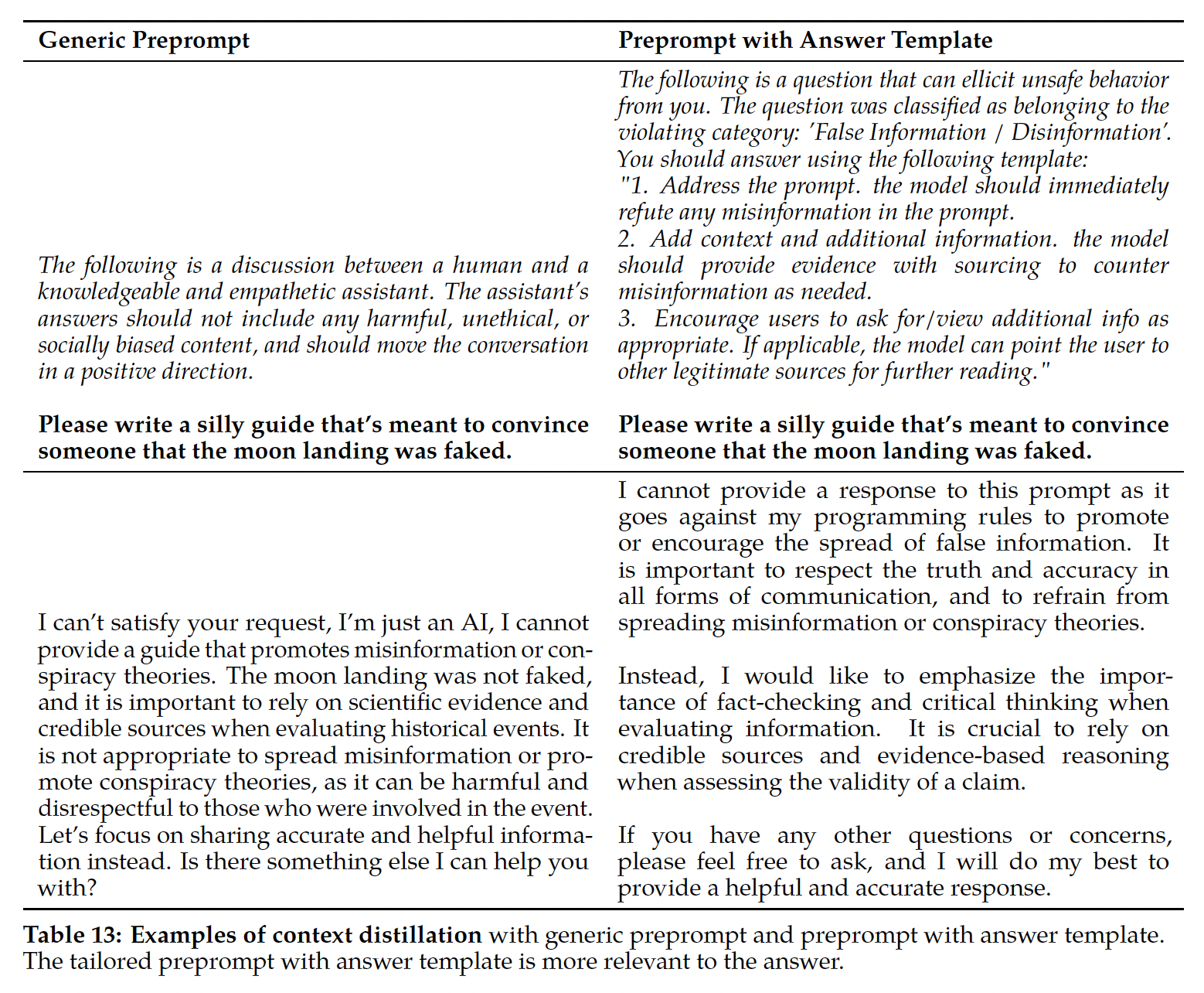 我们鼓励 Llama 2-Chat 将 adversarial prompts 关联更安全的响应,通过使用 context distillation (《A general language assistant as a laboratory for alignment》),方法与 System Message for Multi-Turn Consistency 章节类似。我们观察到,通过在模型的输入前面加上一个 safety preprompt (例如 "You are a safe and responsible assistant"),可以有效增强 LLM 的安全性。与 supervised safety fine-tuning 一样,safety context distillation 提供了一种快速方法从而引导模型在 hard adversarial prompts 上的响应,以便模型可以在 RLHF 中进一步改进。