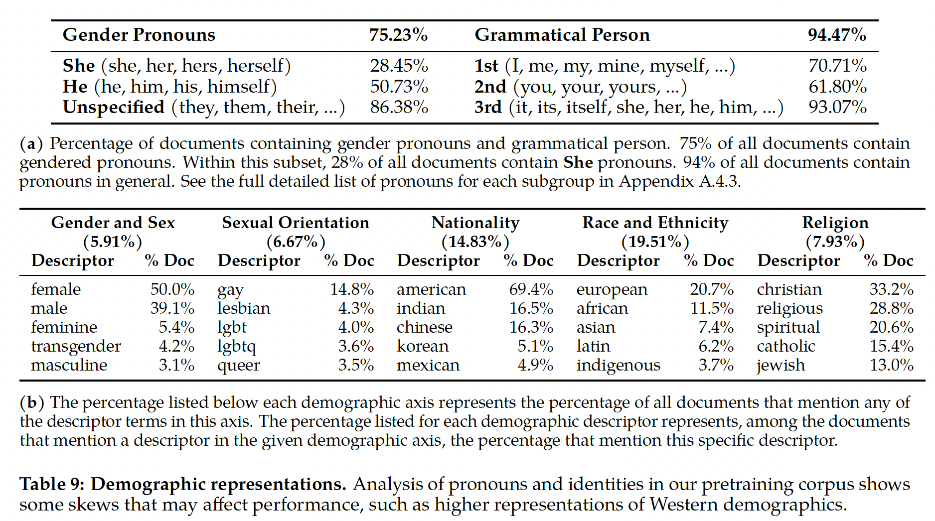 Demographic Representation: Pronouns:model generations 中的 bias 可能源自训练数据本身的 bias 。例如,《Based on billions of words on the internet, people = men》 指出,在大规模文本语料中,代表 "people" 的单词与代表"men" 的单词(而不是代表 "women" 的单词)的上下文往往更为相似;并且 《On the impact of machine learning randomness on group fairness》 证明,模型在公平性(fairness)指标上的表现,高度依赖于模型如何在 underrepresented demographic 群体的数据上进行训练。在我们的英语训练语料中,我们计算了在 Table 9a 中最常见英语代词(English pronouns)的频率。我们观察到:文档中的 He 代词一般比 She 代词更多,这反映了在类似规模的预训练数据集中,代词的使用频率差异(《Palm: Scaling language modeling with pathways》)。这可能意味着模型在预训练期间学习关于提到 She 代词的上下文更少,因此可能随后以比 She 代词更高的比例来生成 He 代词。