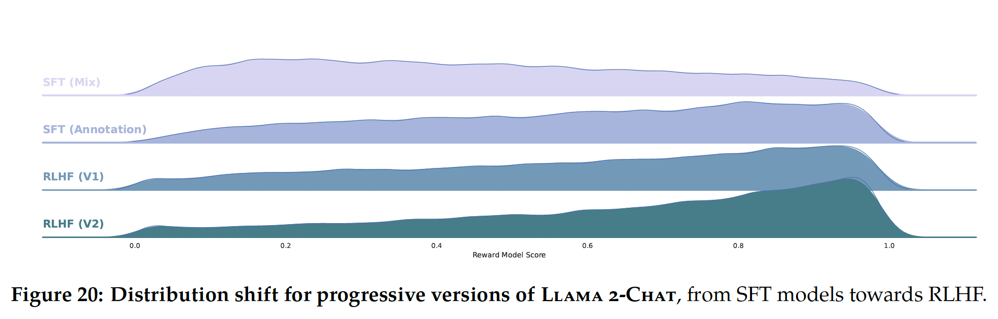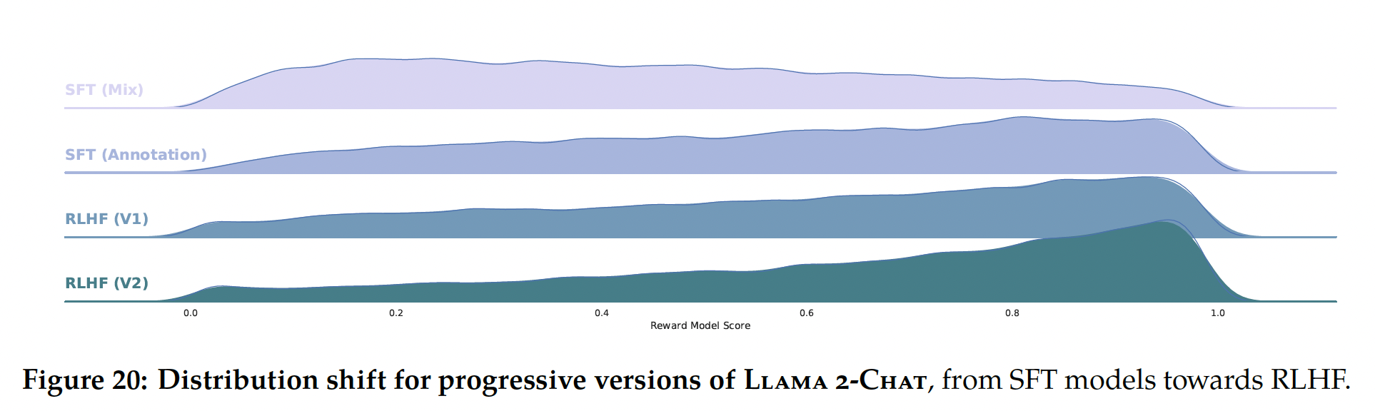 在 Figure 14 中,我们绘制了safety 测试集上 safety RM 的分数分布的变化(左图)、以及helpfulness 测试集上 helpfulness RM 的分数分布的变化(右图)。